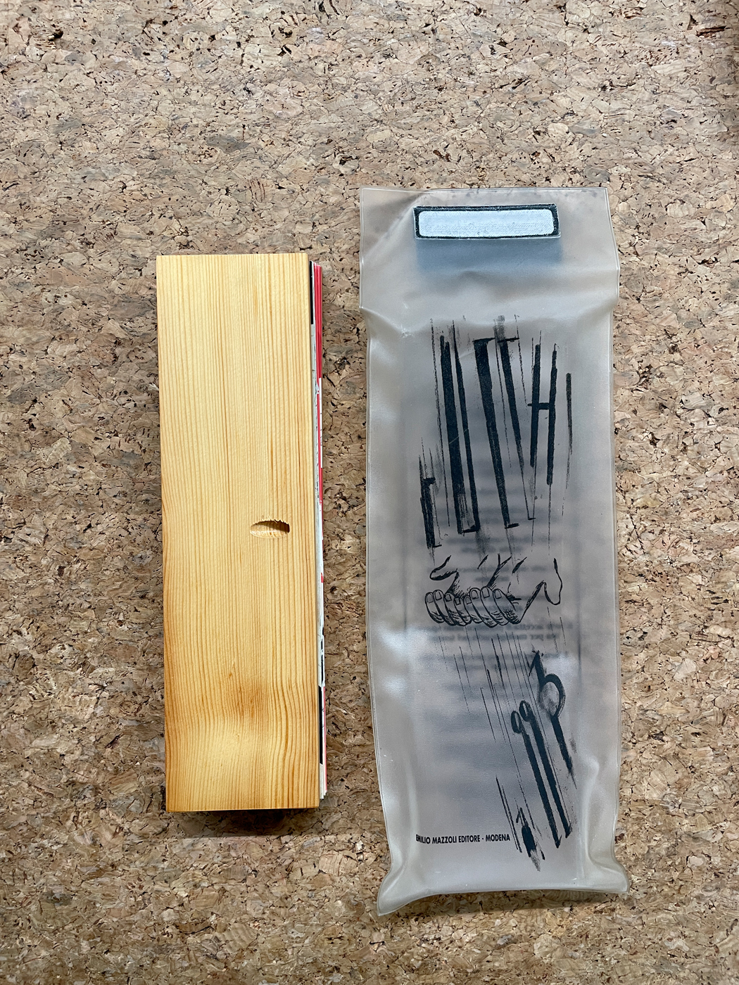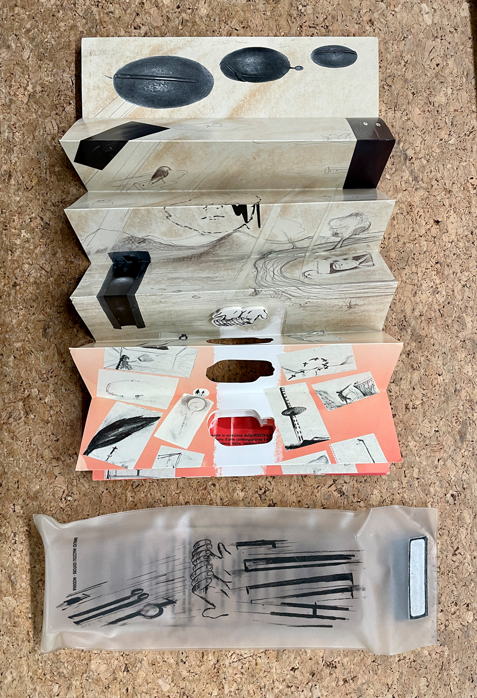 Entro plastica serigrafata protettiva originale recante al fronte illustrazioni dell'Artista e al retro testi di Achille Bonito Oliva