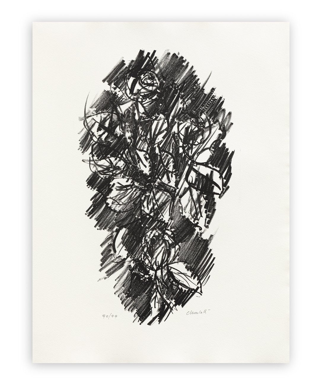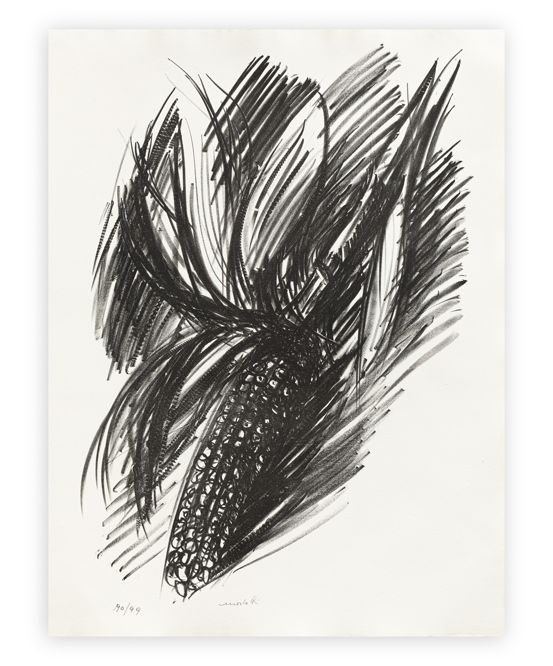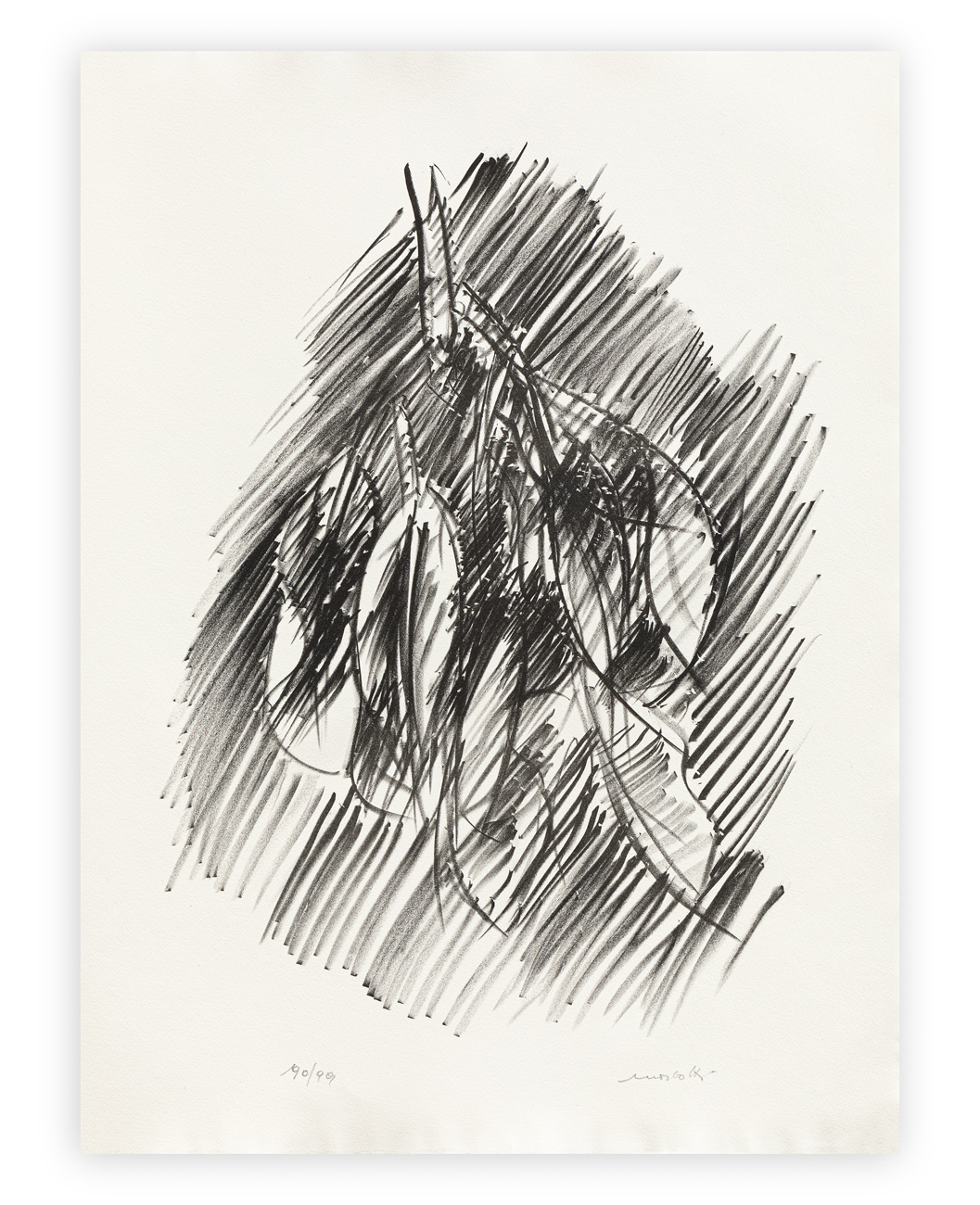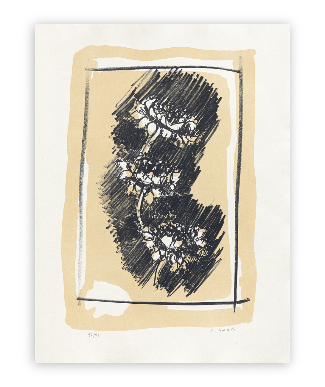 Cartella contenente poesie di Raffaele Carrieri, Camillo Pennati e Antonino Uccello e 8 litografie originali di Ennio Morlotti (Girasoli su fondo rosa; Granoturco; Rose; Ortensie; Foglie di magnolia; Girasoli; Carciofi; Cactus), ciascuna recante firma e numerazione (Esemplari 90/99) a matita al fronte