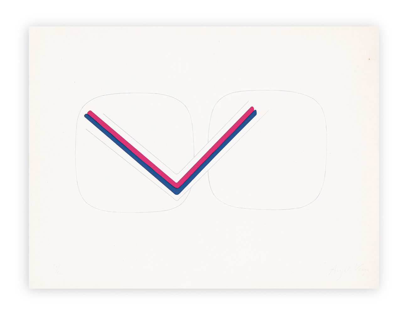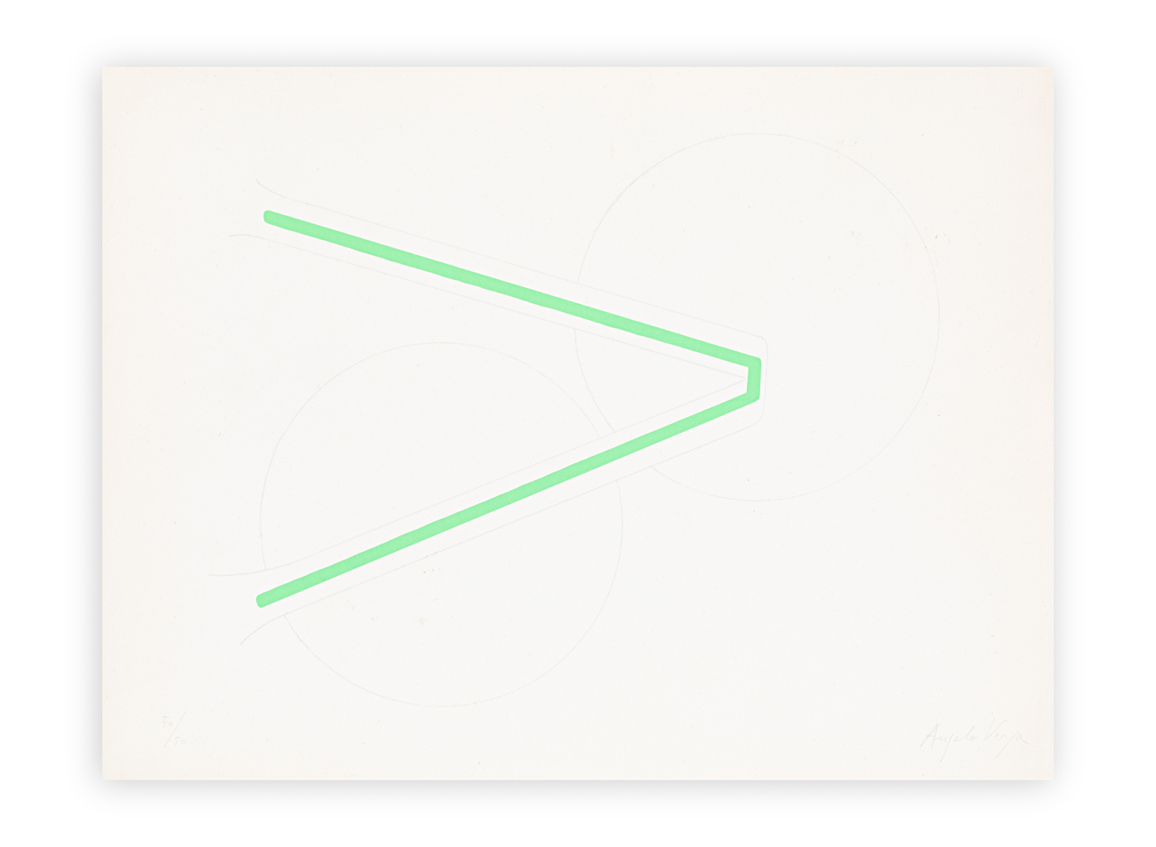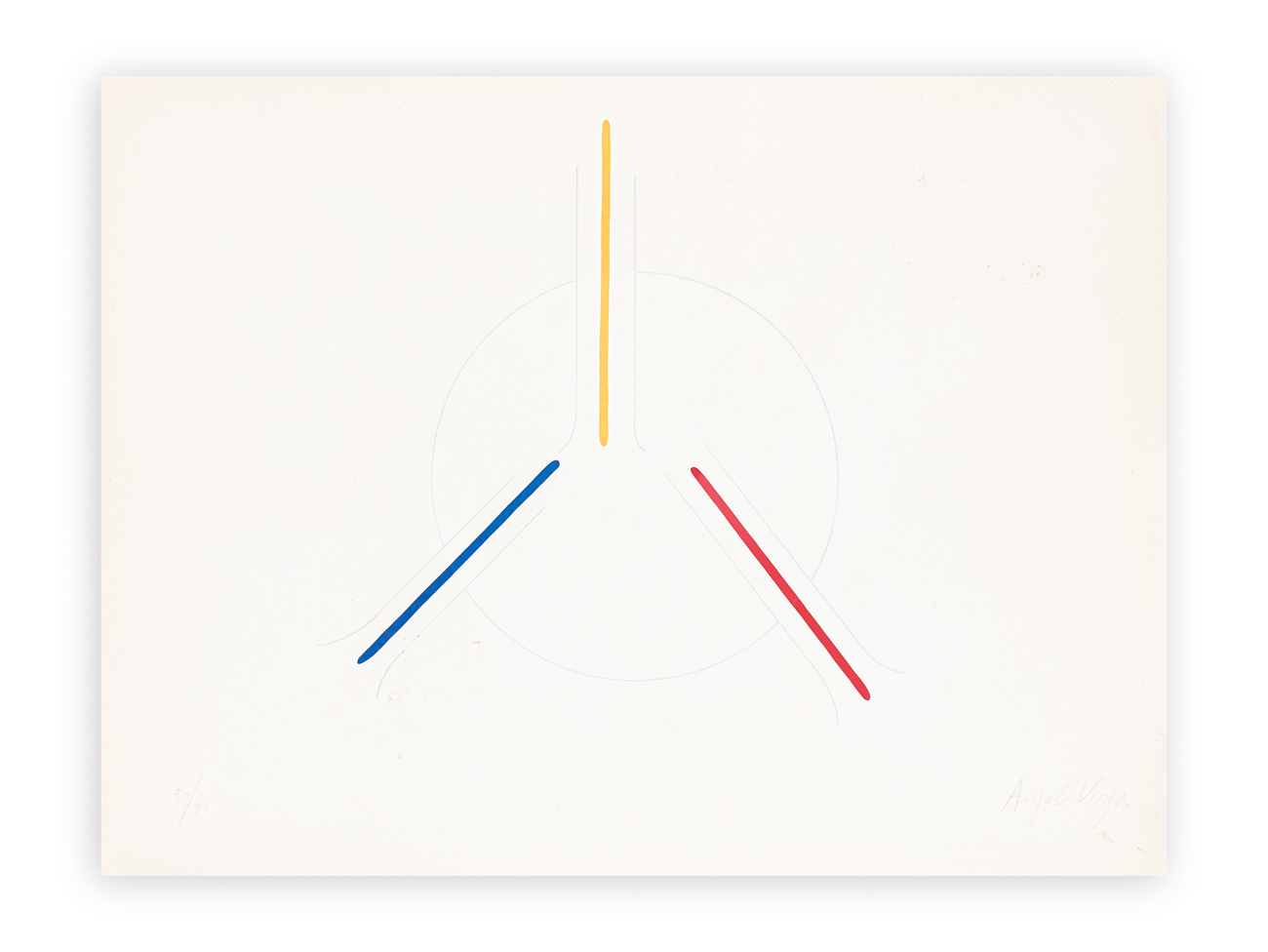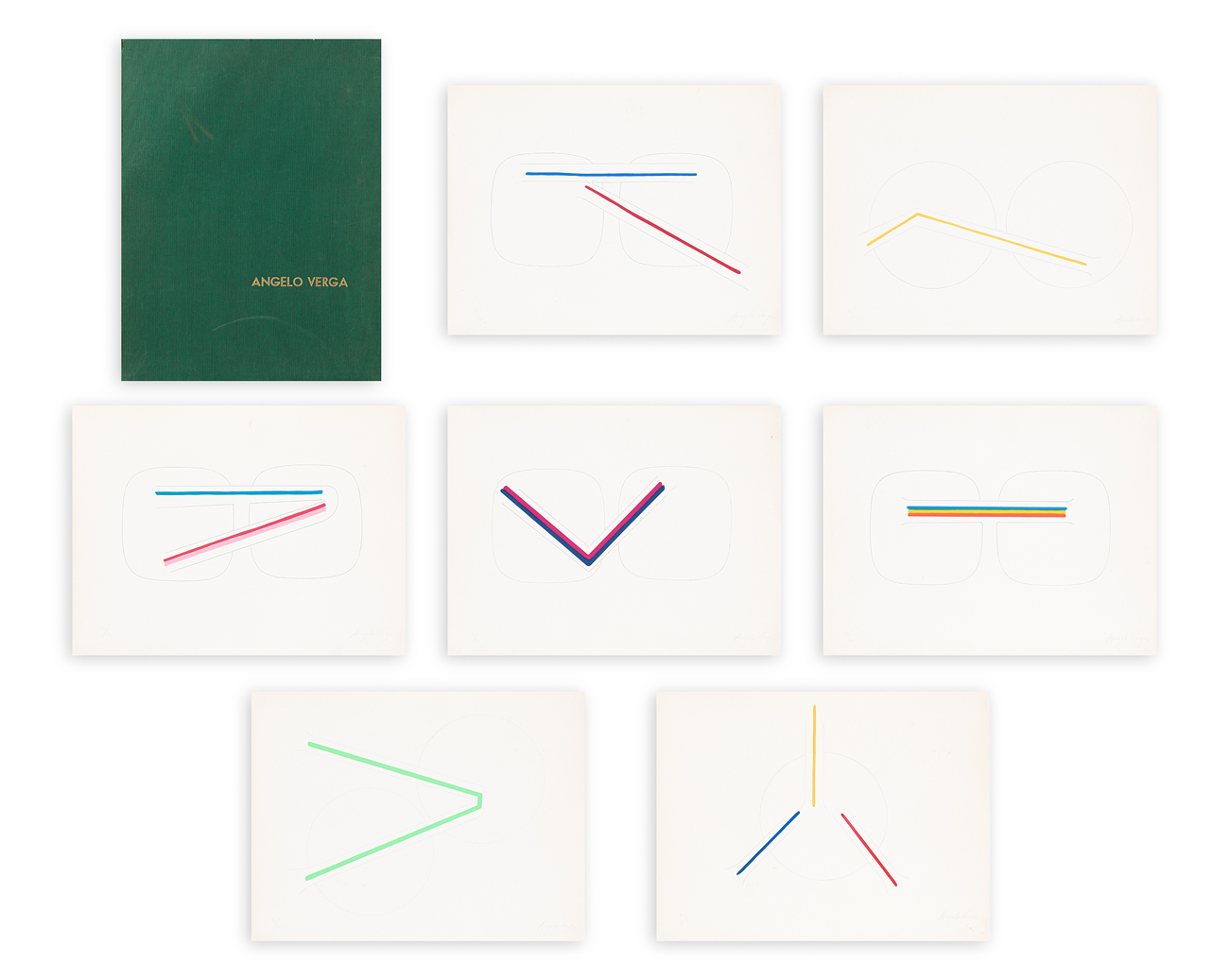 Cartella contenente 3 poesie di Roberto Sanesi, testo di presentazione di Samuele Villa, colophon di presentazione numerato e 7 serigrafie di Angelo Verga, ciascuna recante firma e numerazione (Esemplari 50/50) a matita al fronte