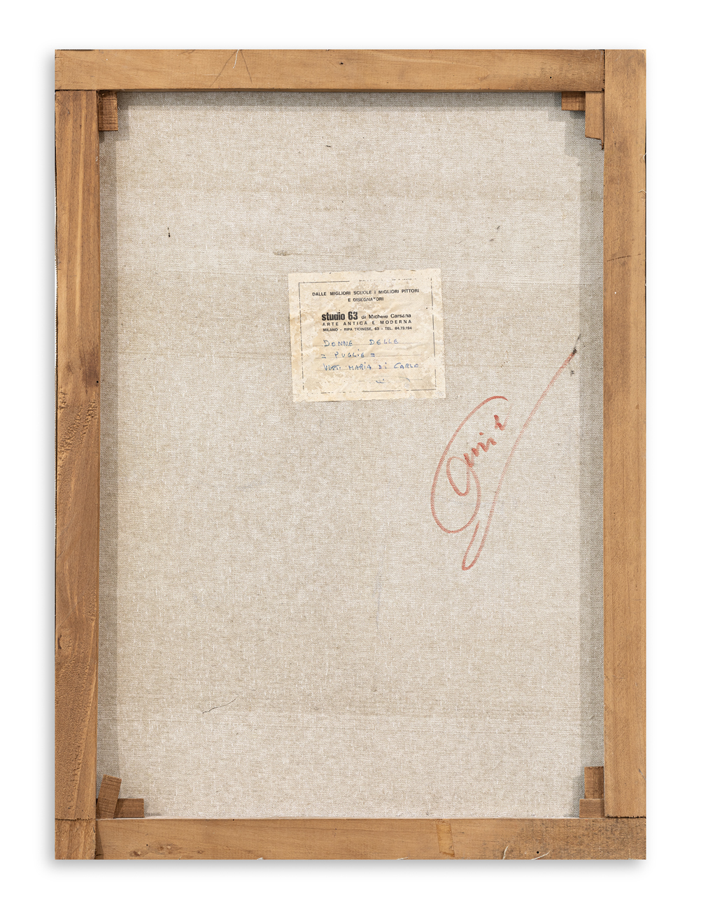 Etichetta dello Studio 63 Arte Antica e Moderna (MI) con caratteristiche tecniche dell'opera al retro