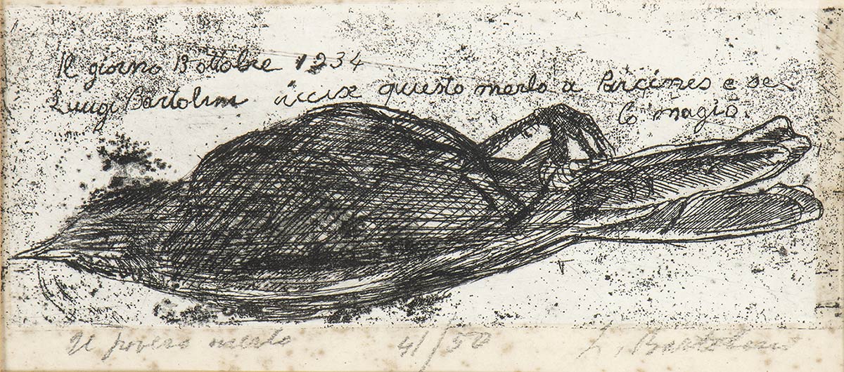 Firmato in basso a destra: L. Bartolini, tiratura in basso al centro: 41/50, titolo in basso a sinistra: Il povero merlo