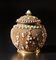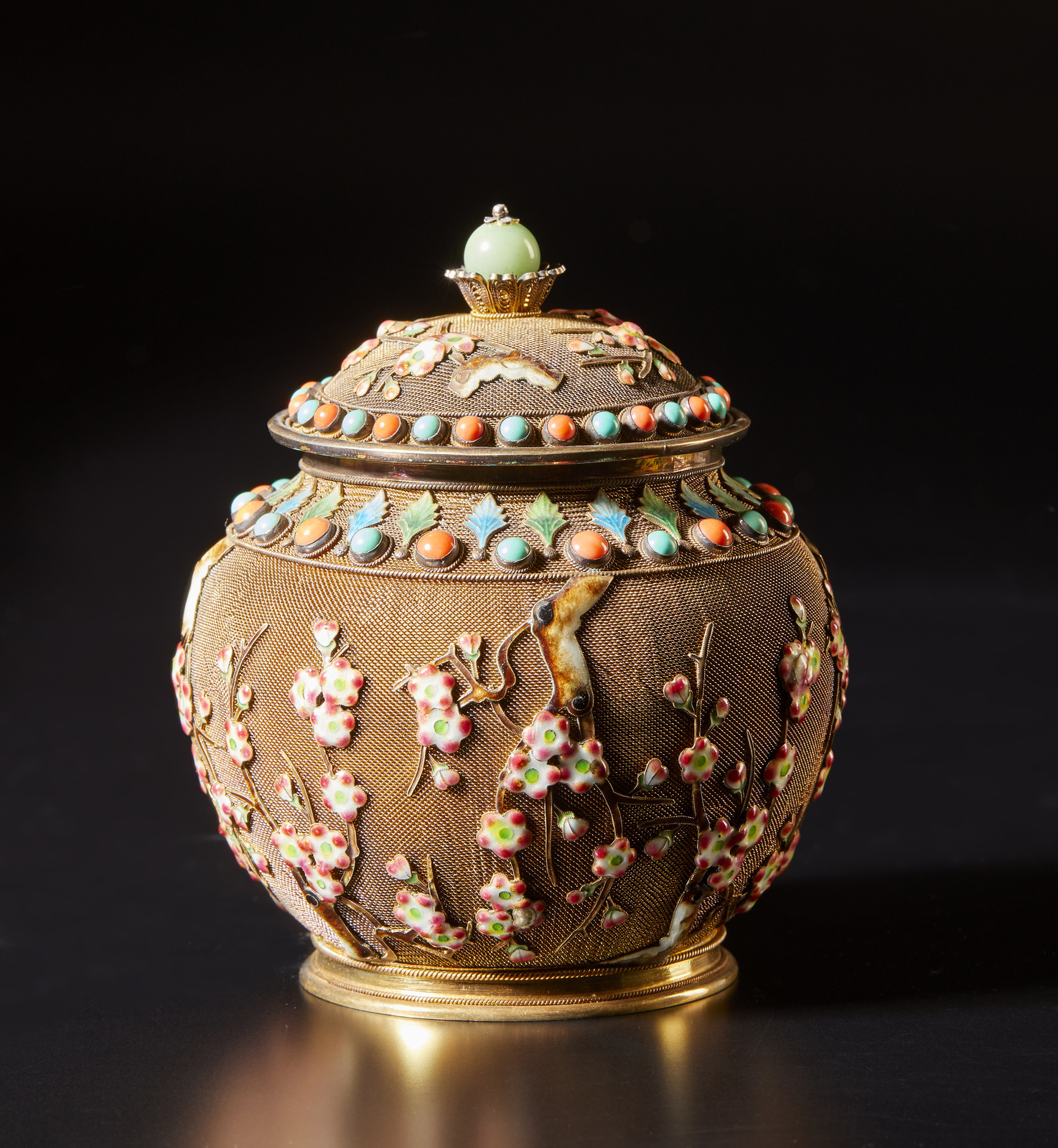 Cina, inizi XX secolo. . . Cm 11,50 x 14,00. Piccola potiche con coperchio, in argento vermeil e filigrana d'argento incrostata con pietre semi-preziose e decorata con applicazioni smaltata in forma di fiori di ciliegio. . Cornice presente