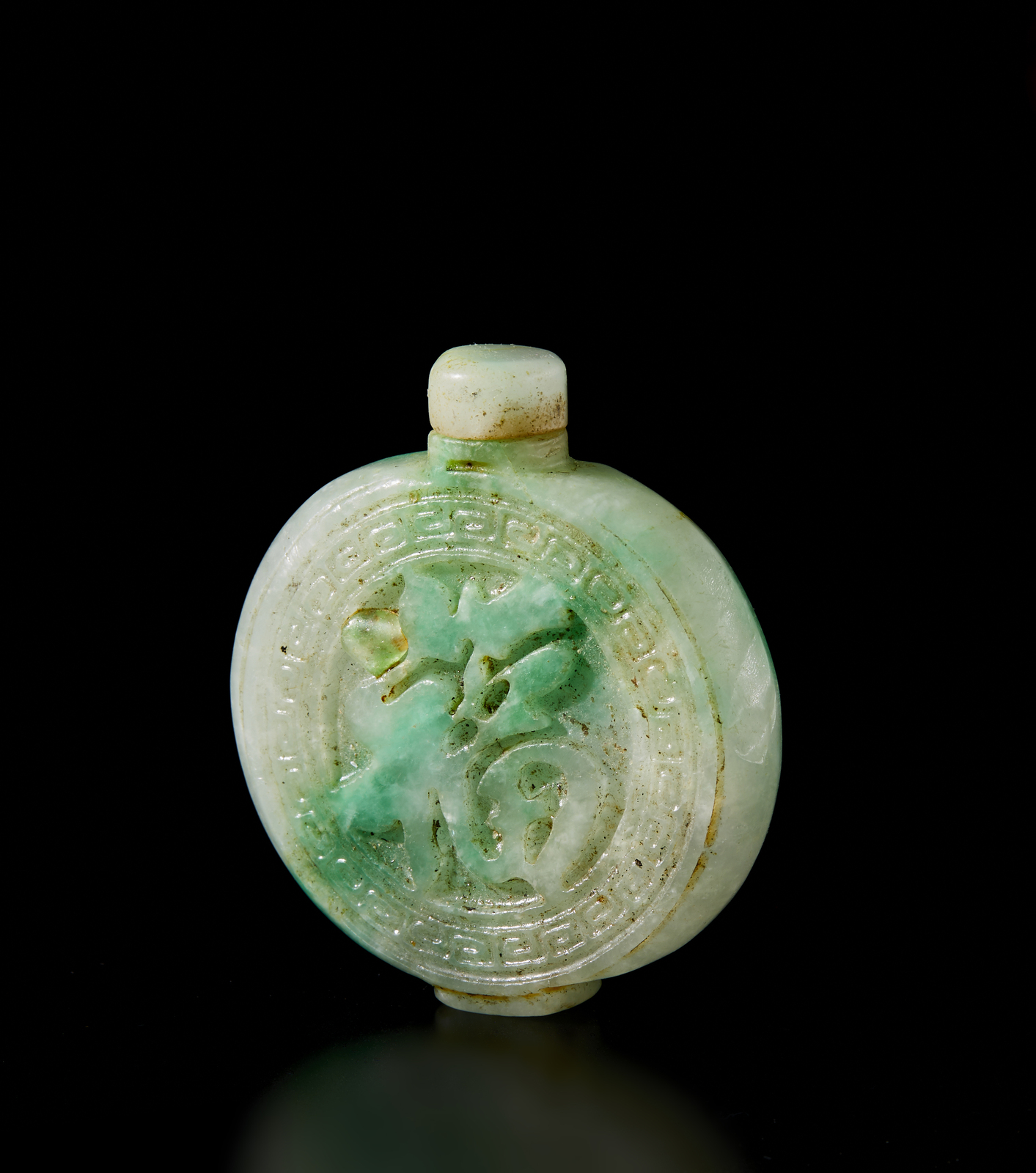 Cina, dinastia Qing, XIX secolo. . Cm 5,00 x 6,00 x 1,00. snuff bottle di forma rotonda schiacciata lavorata ad intaglio in giada bianca con vistose venature verde brillante.