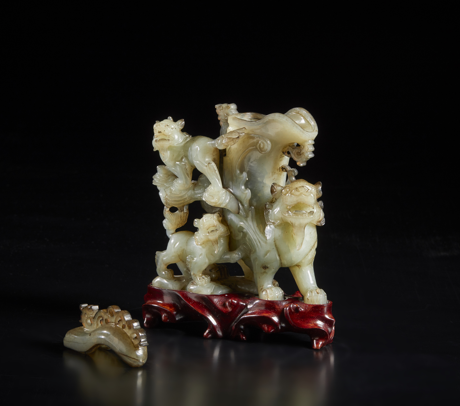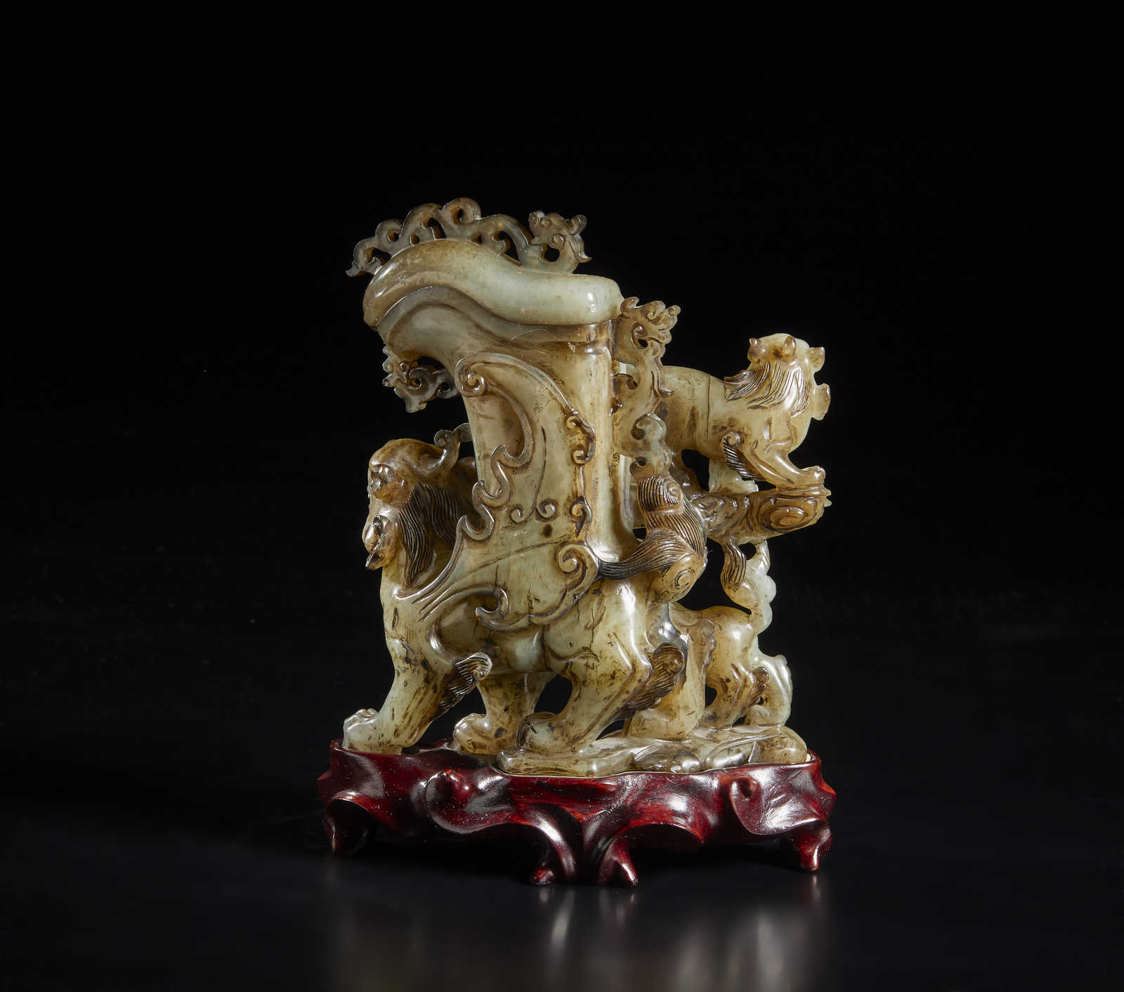 Cina, XX secolo secolo. . Cm 14,00 x 14,00. intaglio in giada abbellito con leoni buddisti. Misure con base: 17,5x17,5 cm