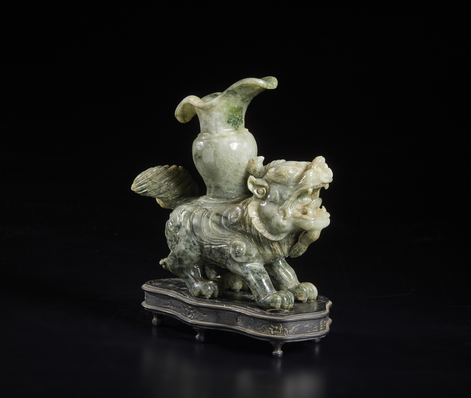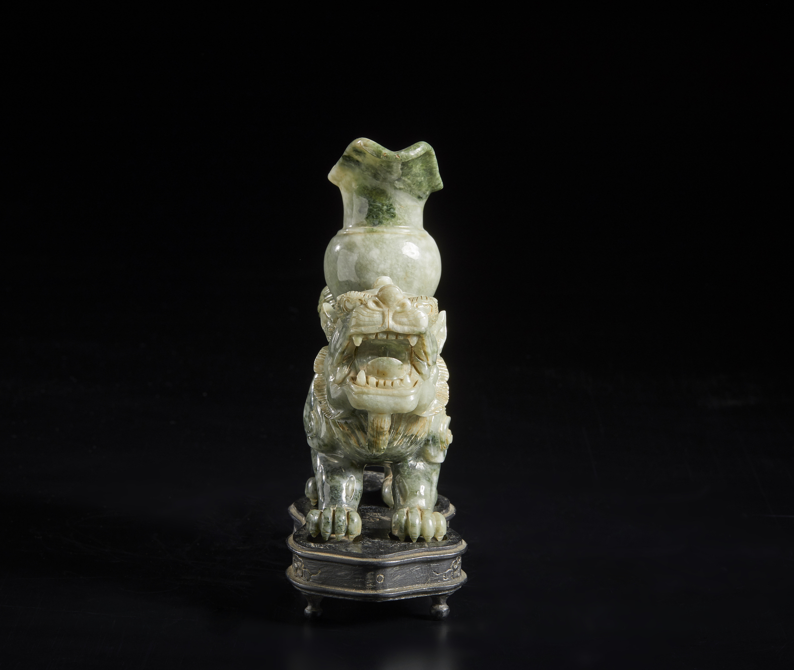 Cina, XX secolo. . Cm 16,50 x 17,00. Raffigurante un leone buddhista con un vaso sulla groppa.