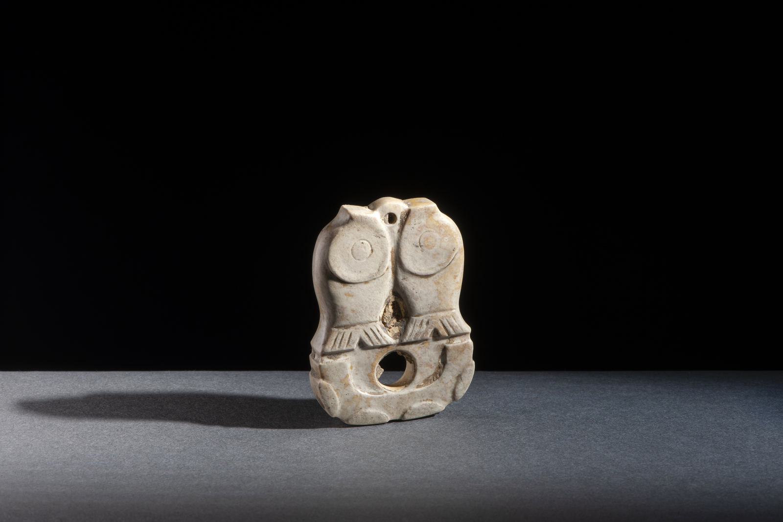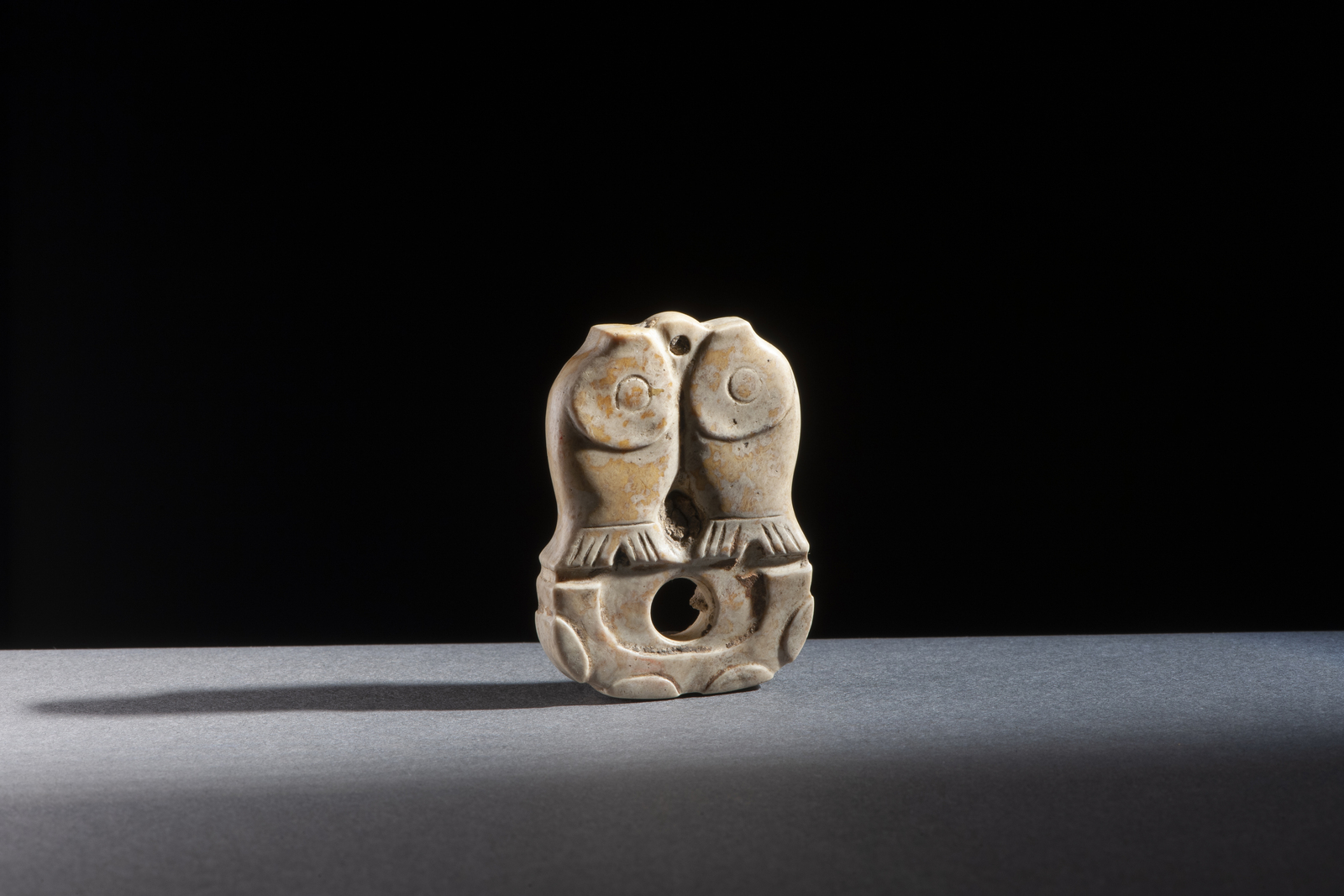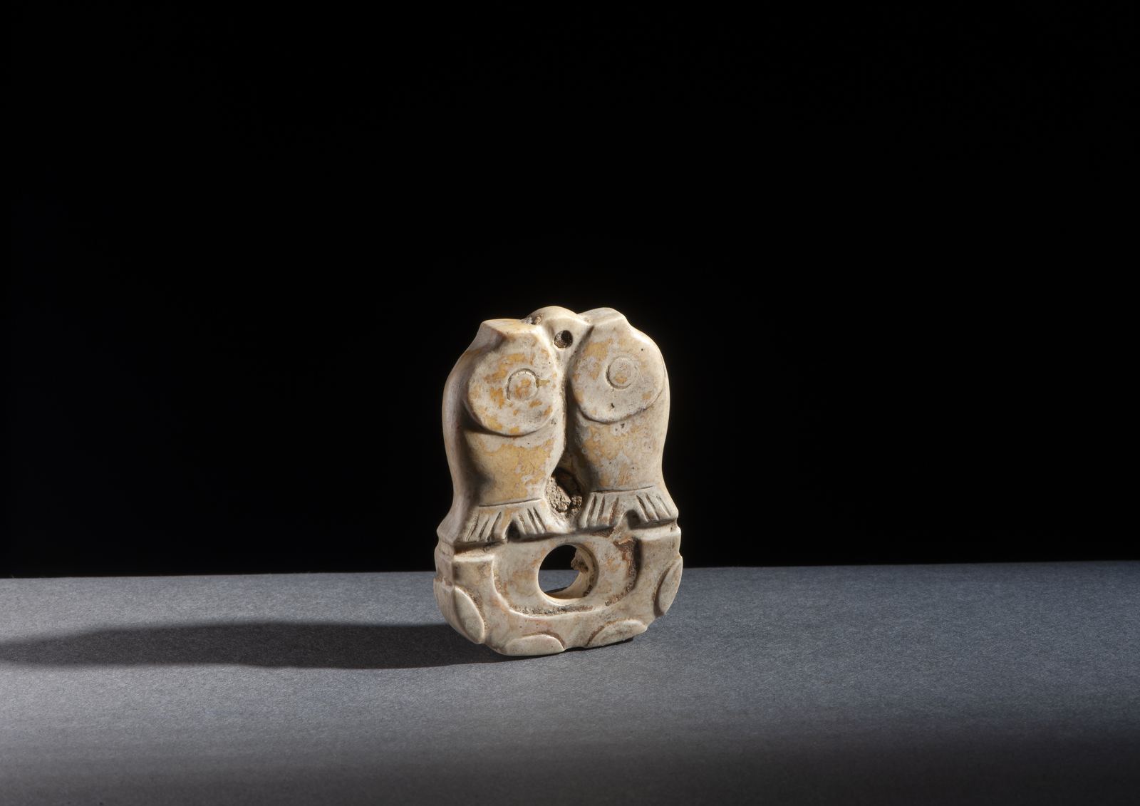 Cina, dinastia Ming (?). . Cm 4,00 x 5,50. intaglio in giada calcificata di colore bianco con screziature gialle, raffigurante due pesci affiancati.
