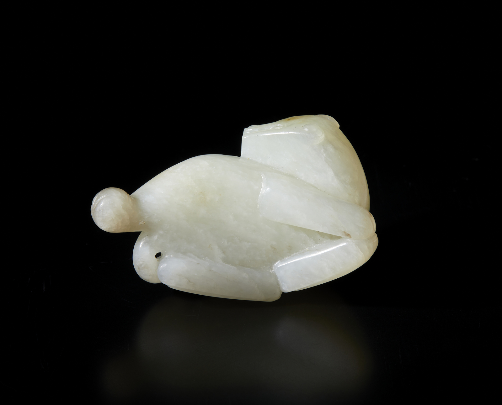 Cina, dinastia Qing, XIX secolo . . Cm 7,00 x 2,50. In giada bianca marezzata, raffigurante forse un Qilin.