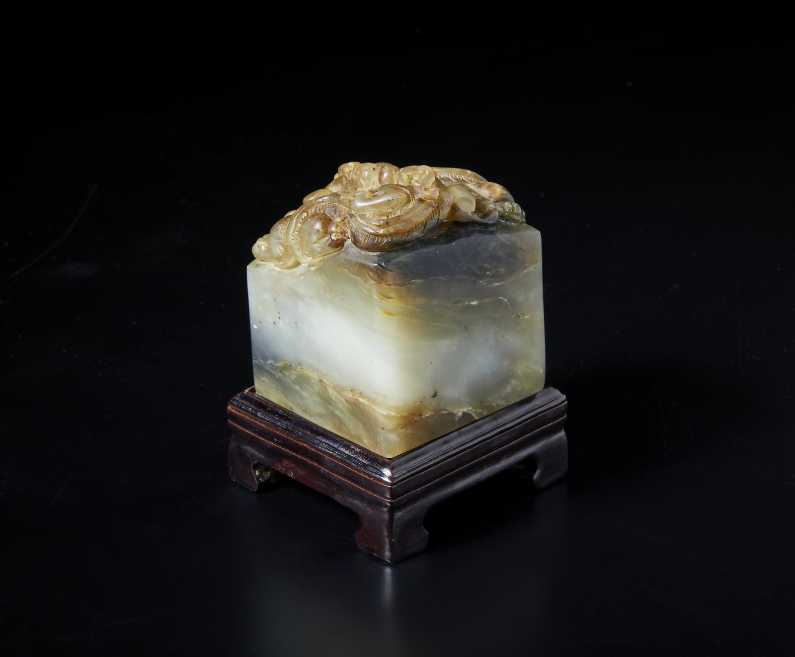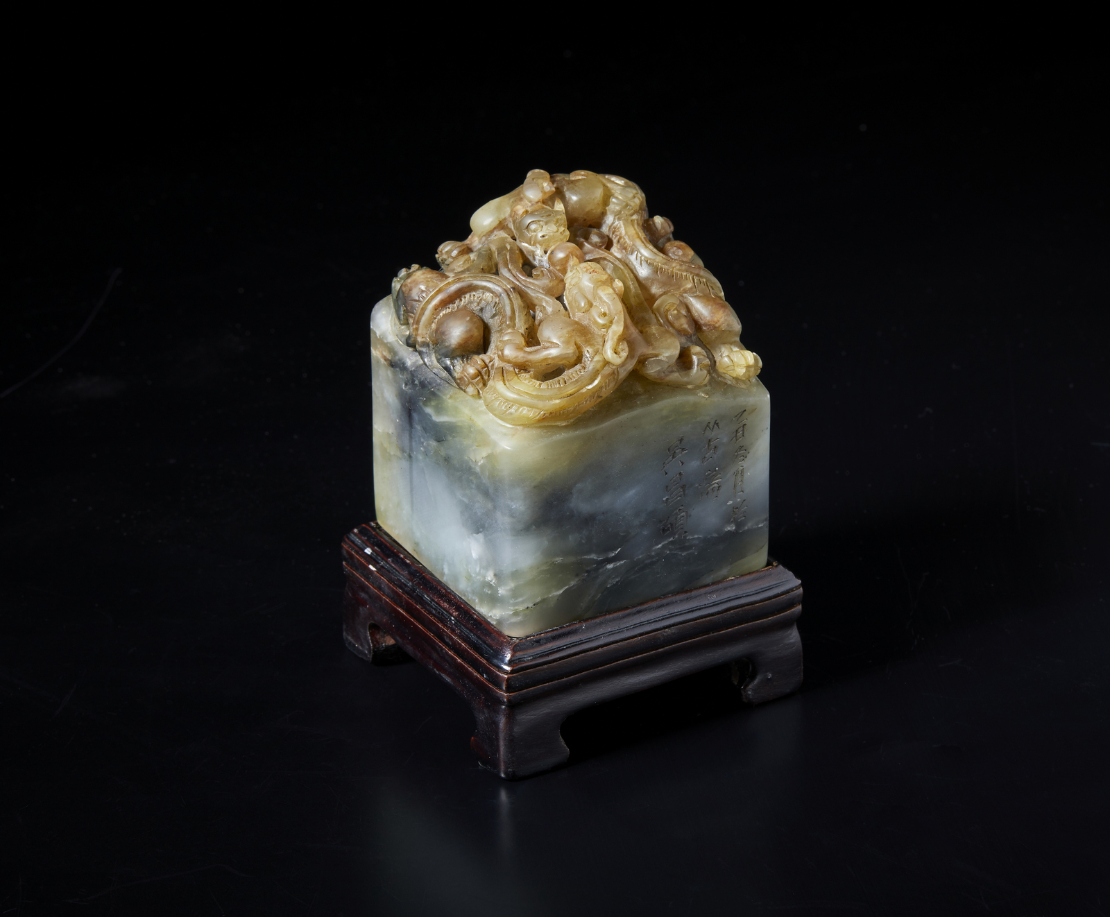 Arte Cinese - Sigillo in pietra saponaria con base in legno. Cina, ,inizi XX secolo.