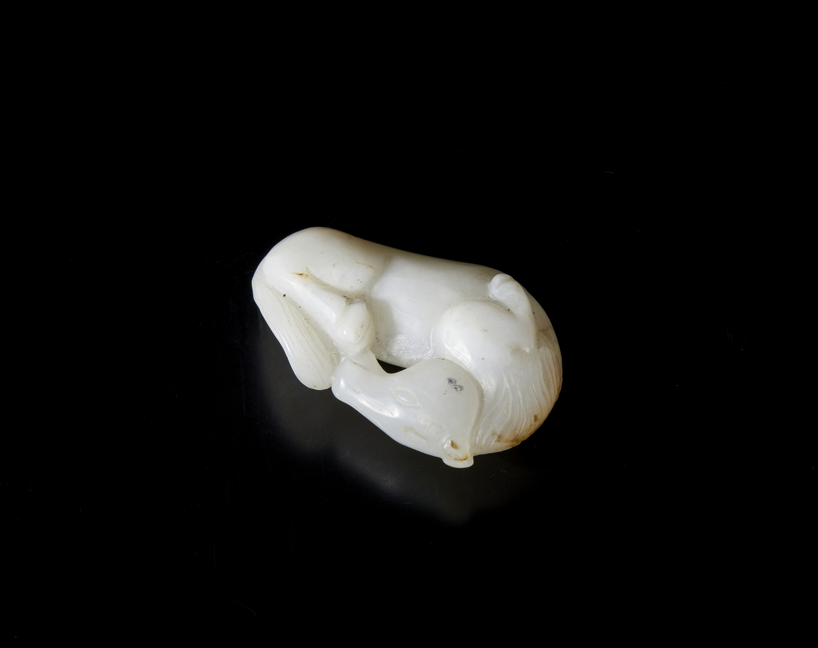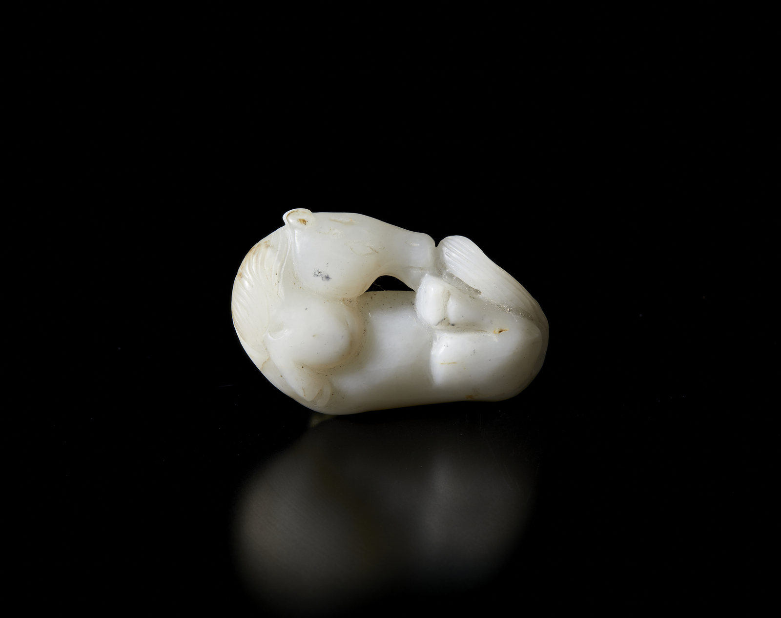 . . Cm 5,00 x 3,00. pendente in giada bianca raffigurante un cavallo disteso sulla schiena alla maniera dell'iconografia Tang.