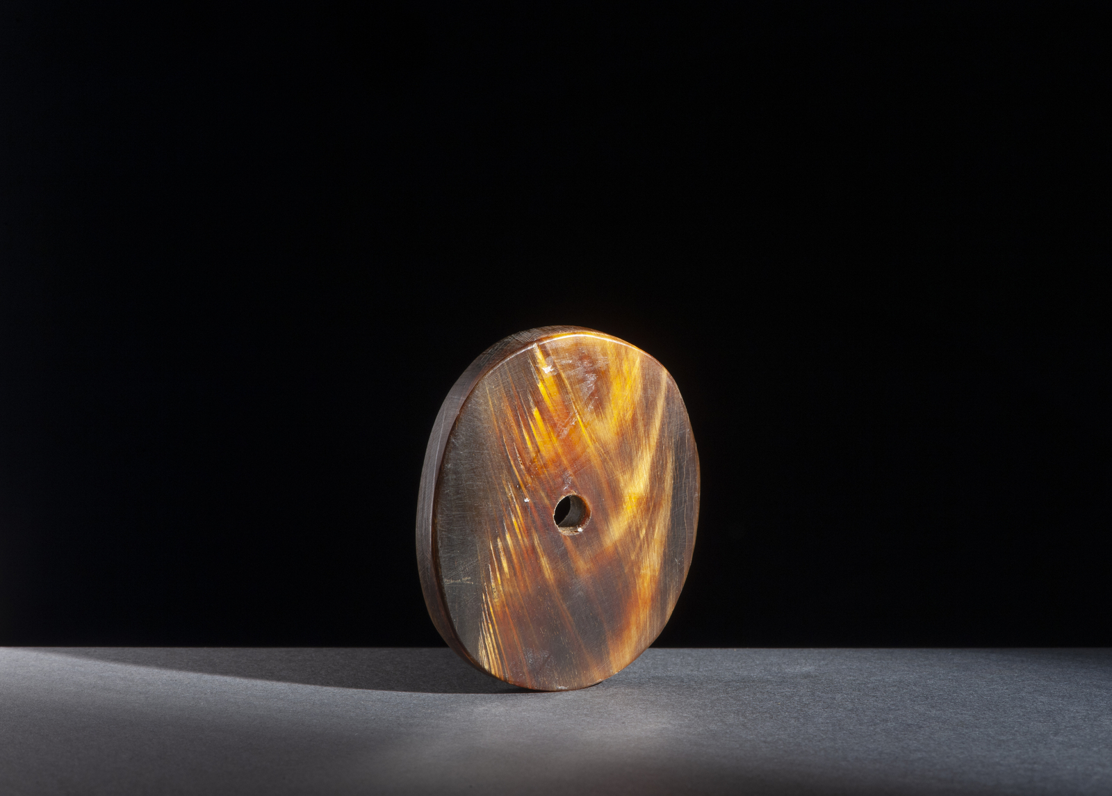 Cina, dinastia Qing. . Cm 5,00 x 6,00. Pendente forato al centro di forma ovale, decorato a rilievo con due qilong che si fronteggiano.