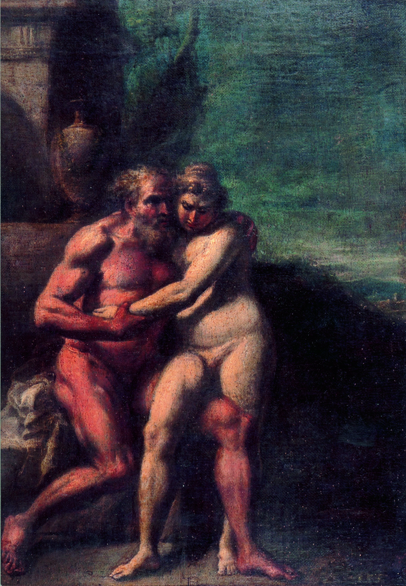 Annibale Caracci Abbraccio Olio su tavola - fine 500/inizio 600 - coppia di...