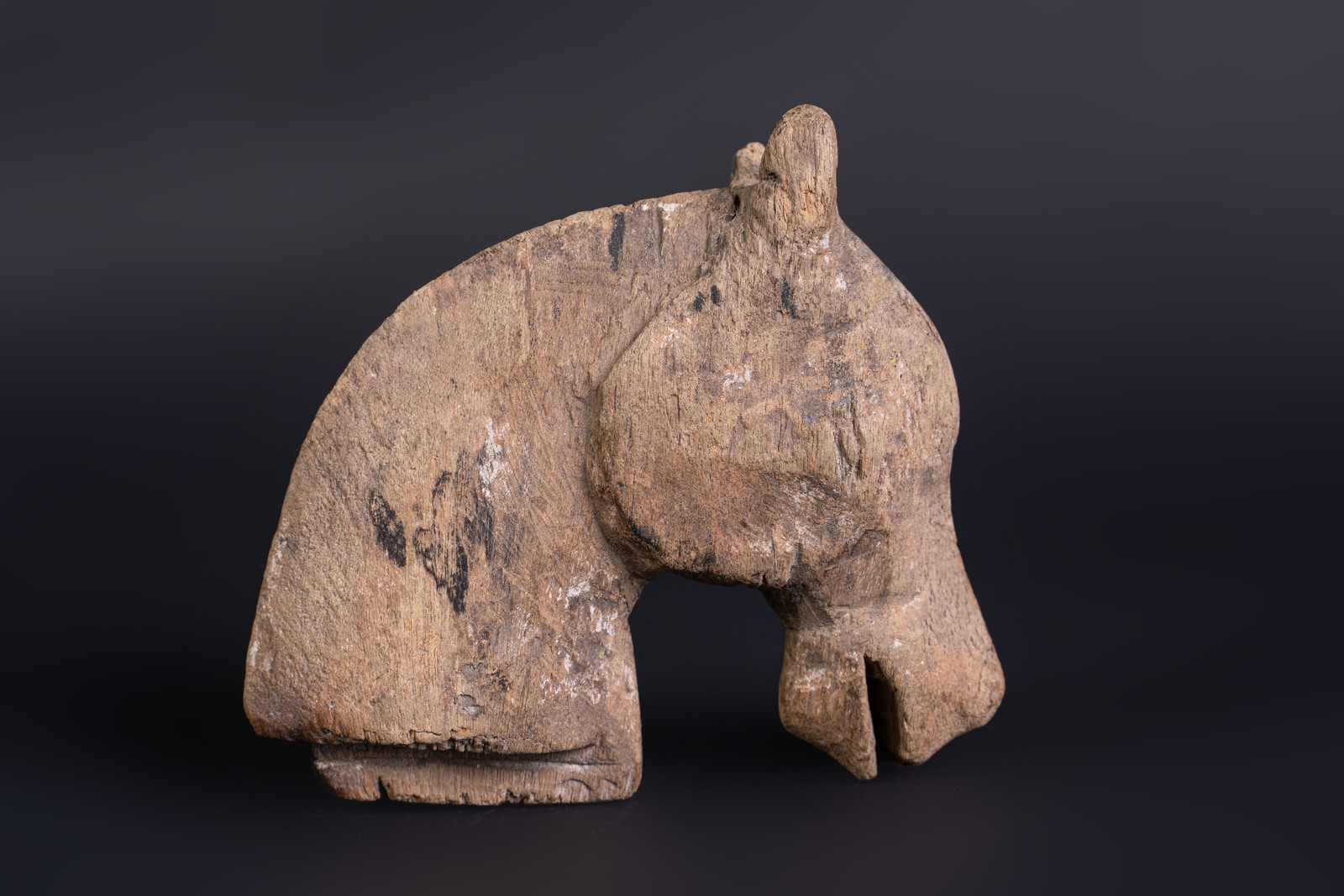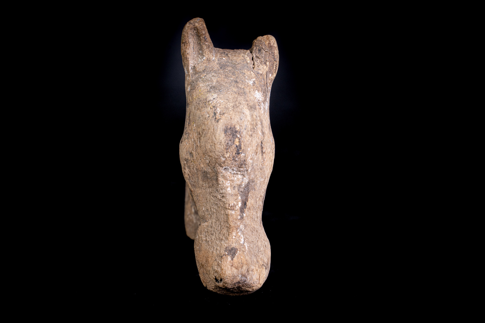 Arte Cinese - Testa di cavallo in legno con tracce di policromia Cina, dinastia Han, 206 a.C - 220 d. C. .
