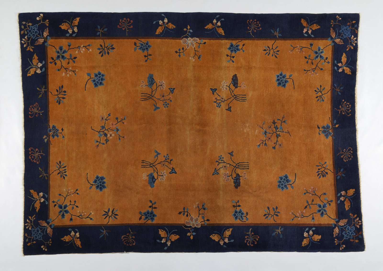 Cina, 1930-1940 . . Cm 186,00 x 257,00. Tappeto in lana e cotone decorato con forio blu su campo beige nel centro e fiori e farfalle in riserva su blu nella bordura.