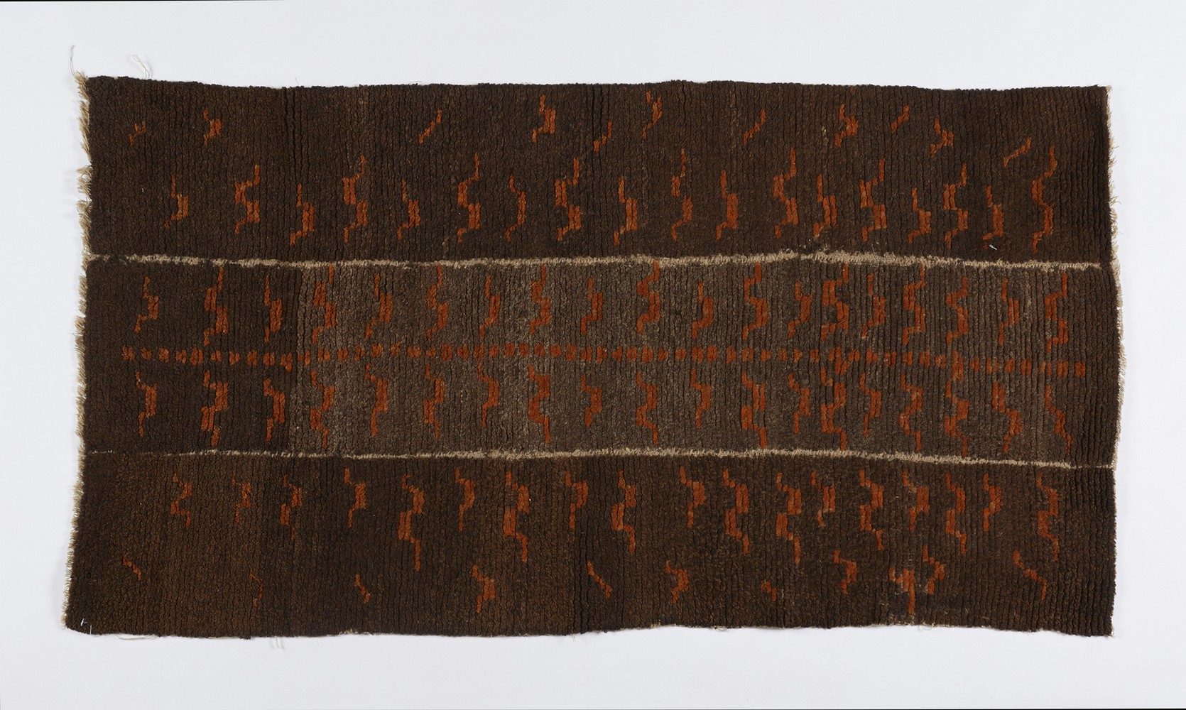 . . Cm 70,00 x 132,00. Bel tappeto tibetano con motivo a pelle di tigre ripetuto su tre campi e delineato in rosso su sfondo marrone.