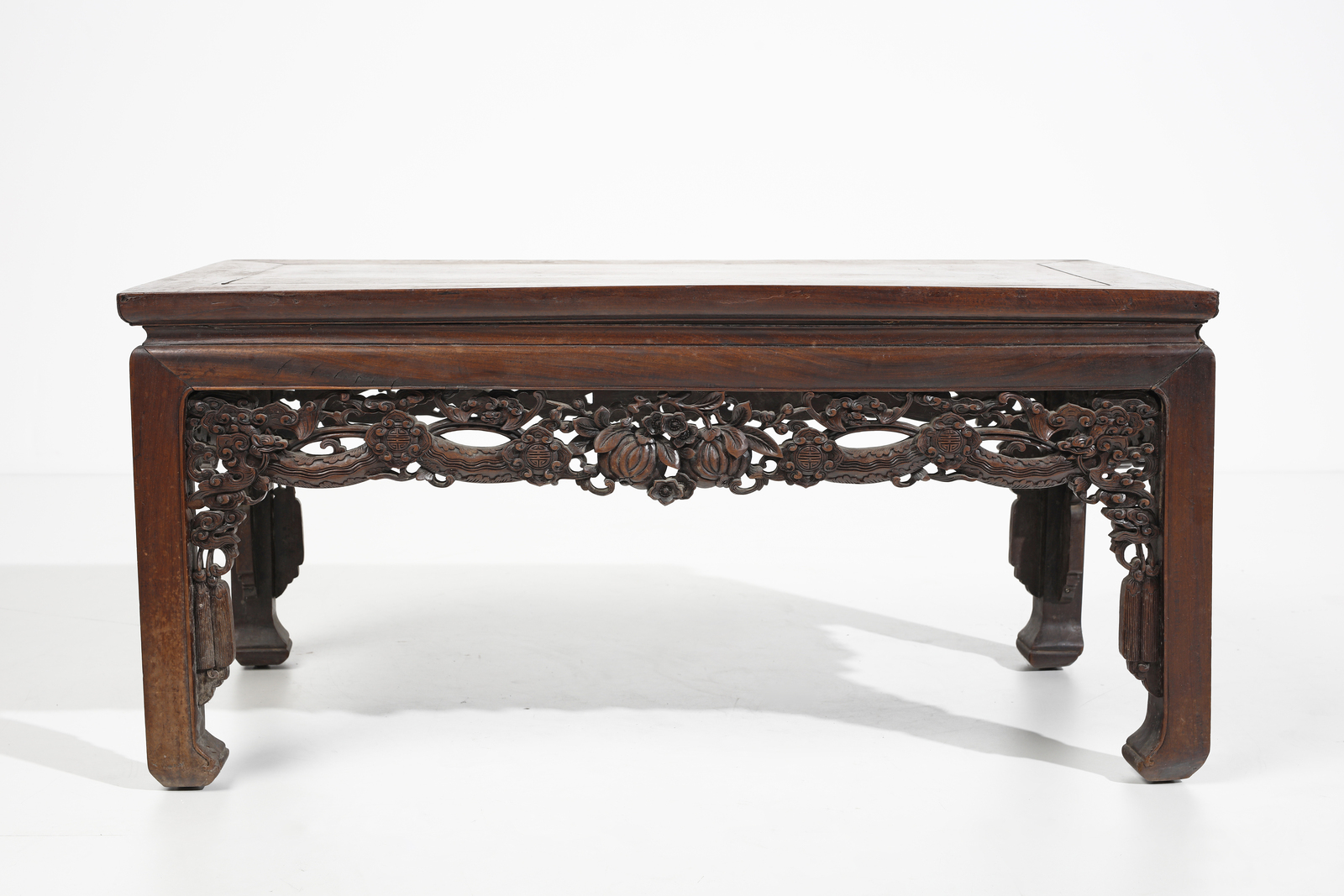 Cina, dinastia Qing, XIX secolo . . Cm 104,50 x 50,00 x 51,50. tavolo basso kang di forma rettangolare, realizzato in legno duro e pesante a patina scura.
