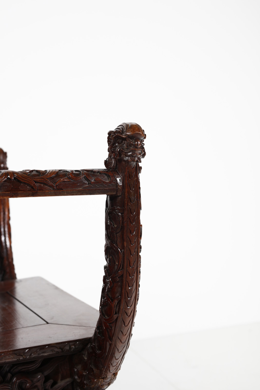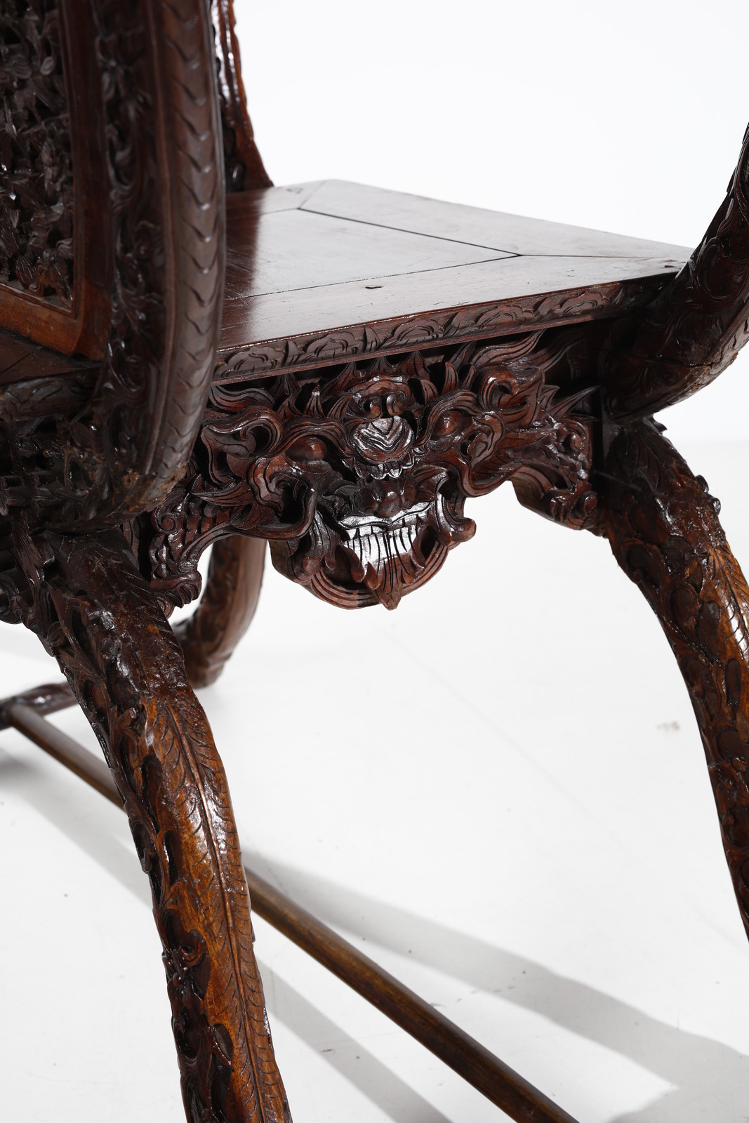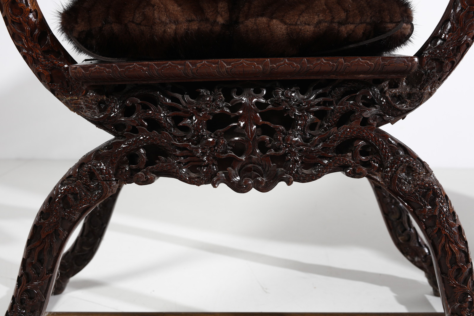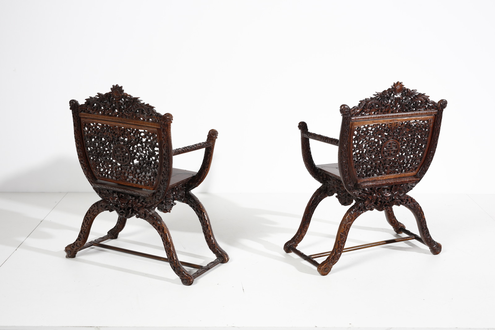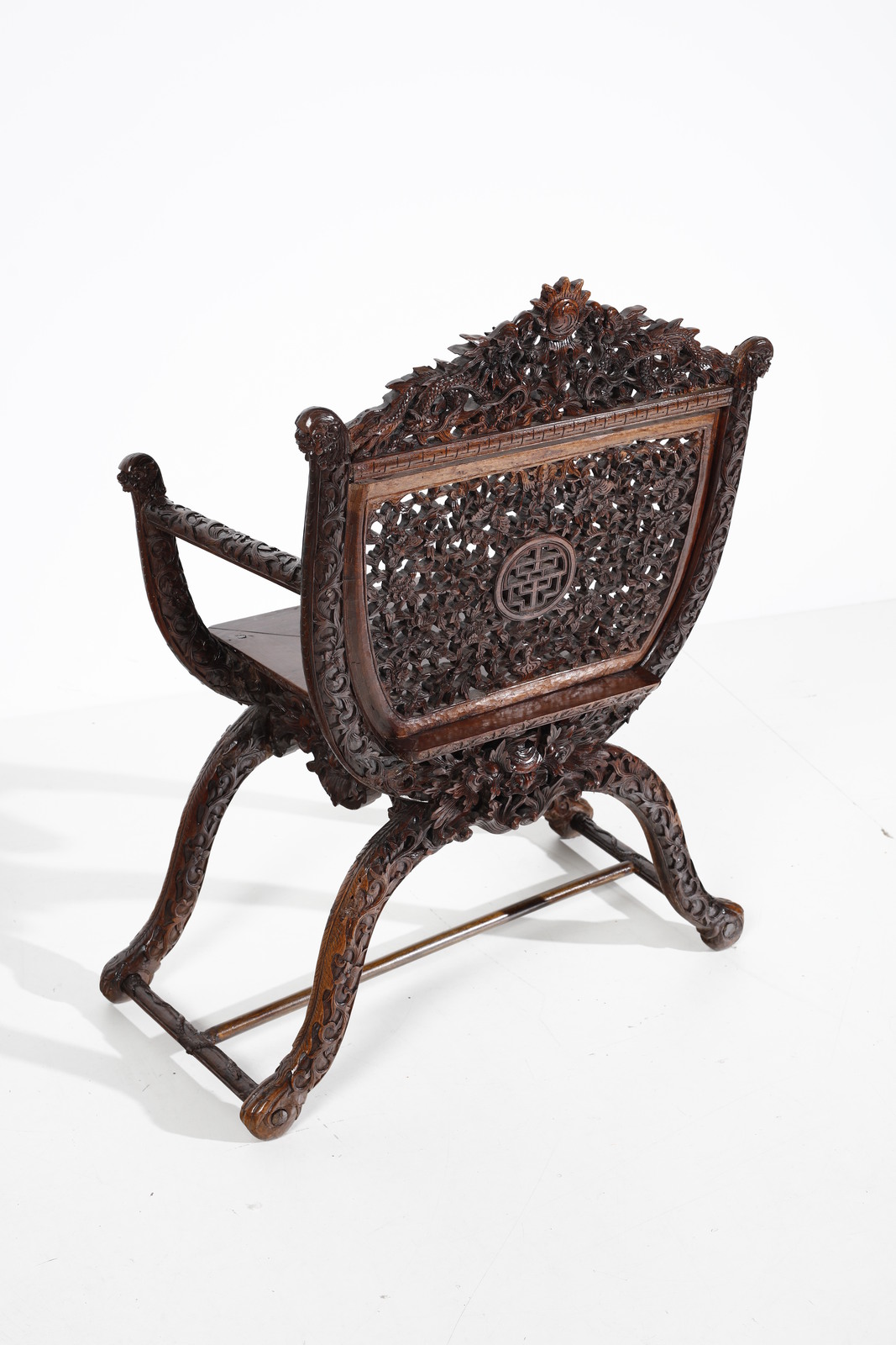 China, inizi XX secolo. . Cm 40,00 x 80,00 x 94,00. coppia di poltrone alla "Savonarola" di manifattura cantonese in legno intagliato a motivi foliati e simboli "shou". Realizzate probabilmente per il mercato europeo.