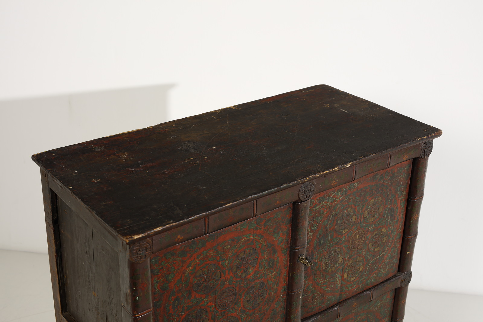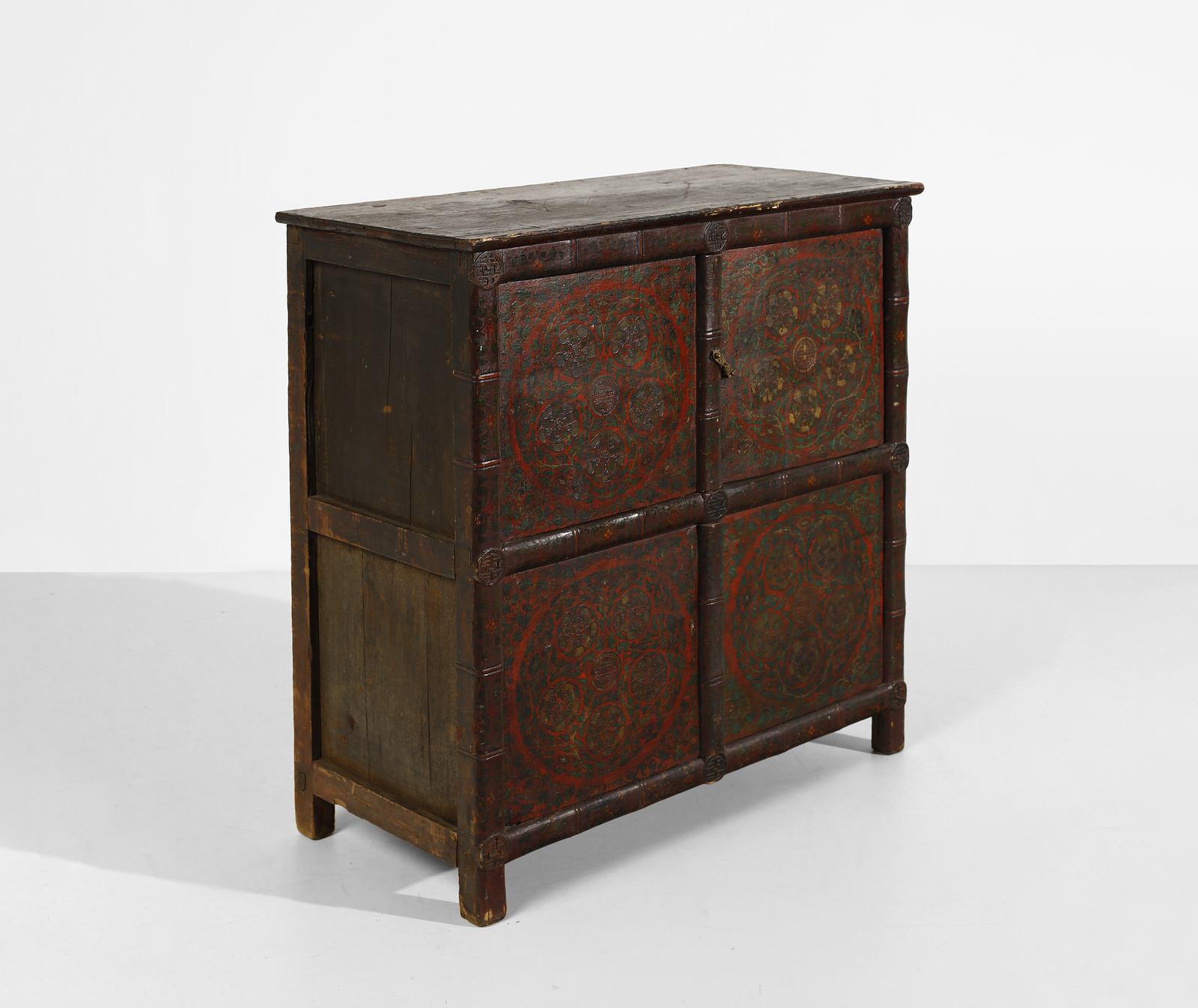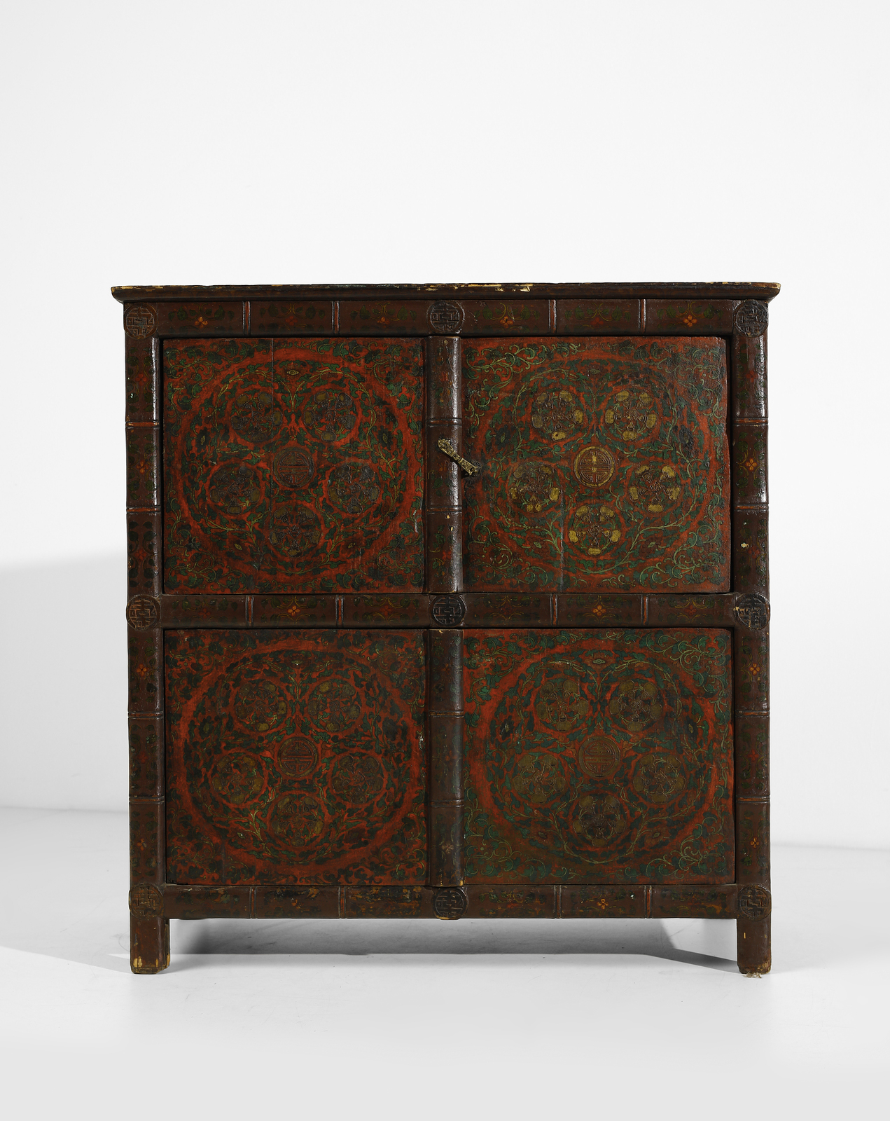 Tibet, XIX - XX secolo . . Cm 42,00 x 69,00 x 26,00. Mobile a due scomparti, ognuno con la sua coppia di ante il cui esterno risulta dipinto in vivace policromia con girali floreali ed elementi vegetali entro riserva circolare.