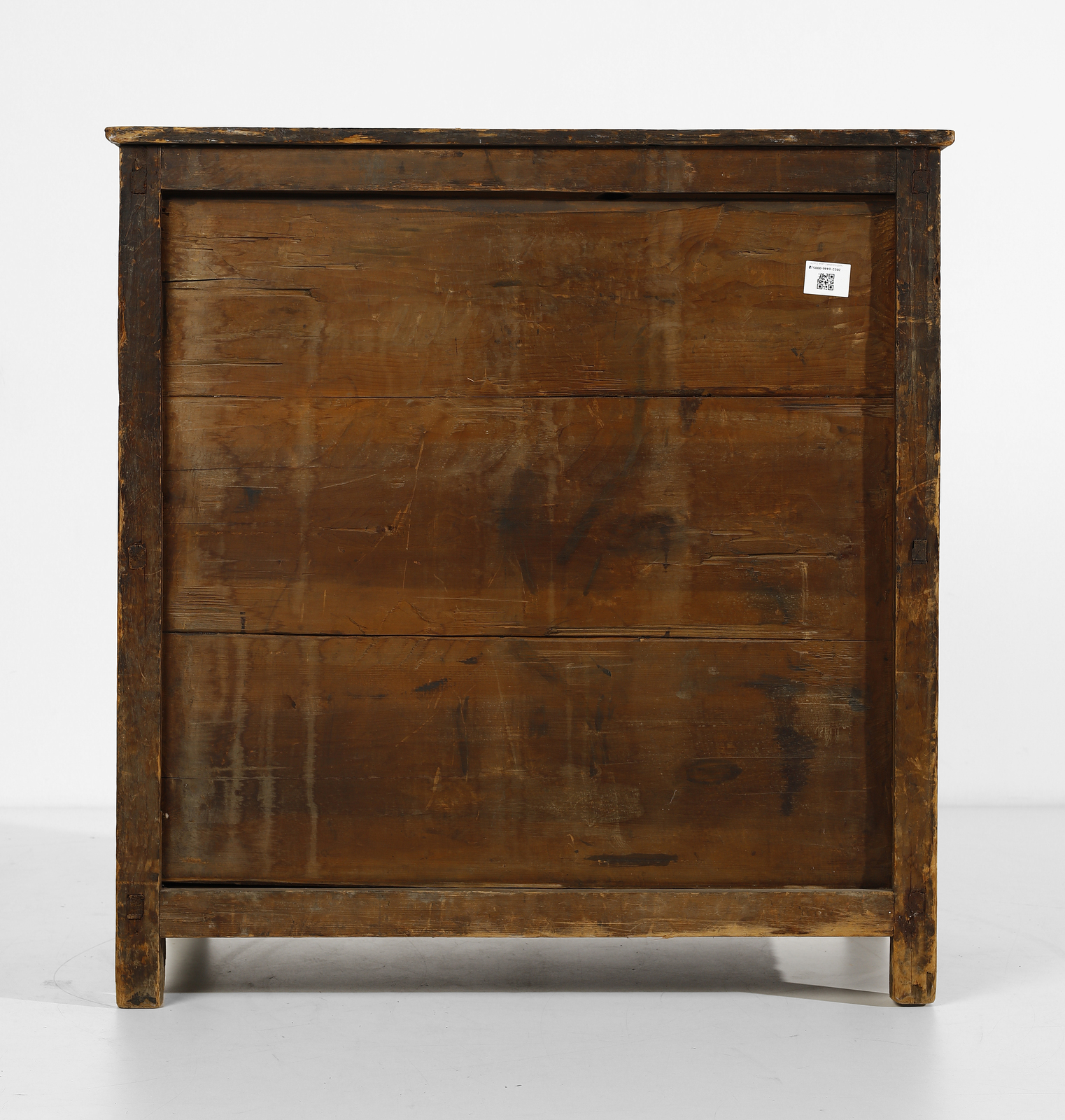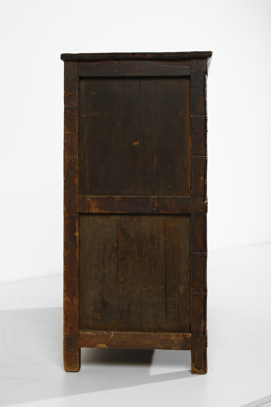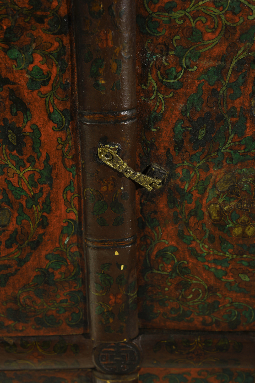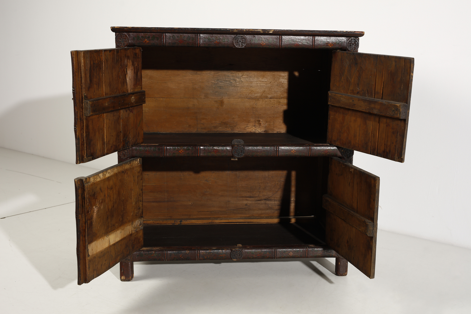 Tibet, XIX - XX secolo . . Cm 42,00 x 69,00 x 26,00. Mobile a due scomparti, ognuno con la sua coppia di ante il cui esterno risulta dipinto in vivace policromia con girali floreali ed elementi vegetali entro riserva circolare.