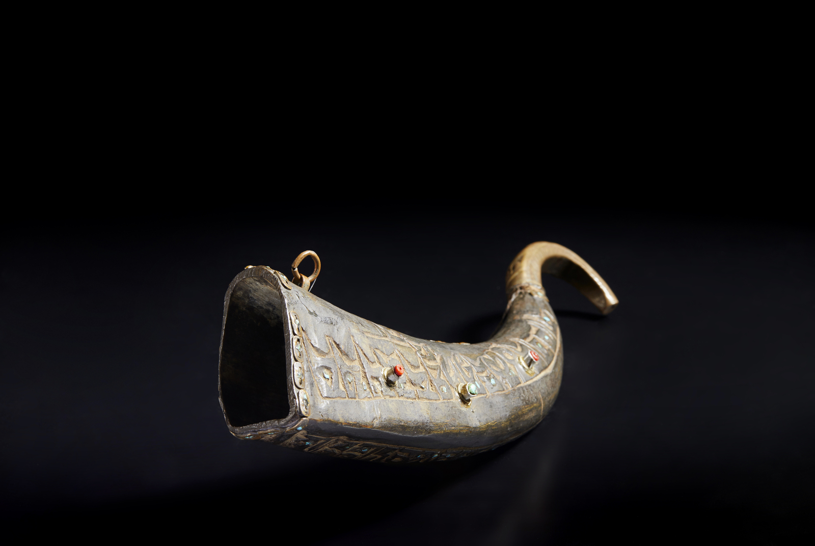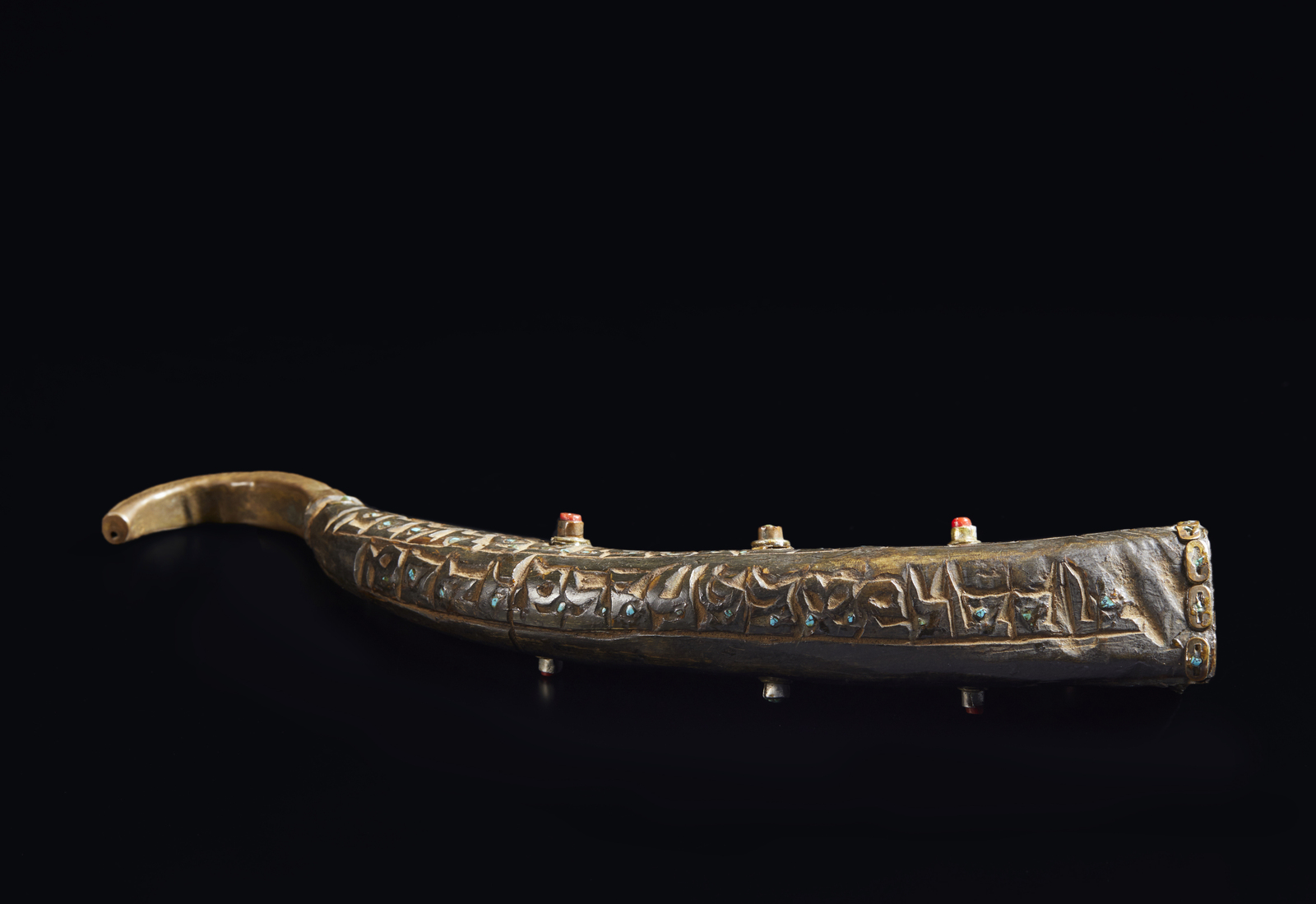 Tibet, XIX secolo . . Cm 8,00 x 32,00 x 4,00. Tromba in corno intagliato con iscrizioni devozionali, completo di finimenti in rame sbalzato e incrostazioni in corallo e turchese.