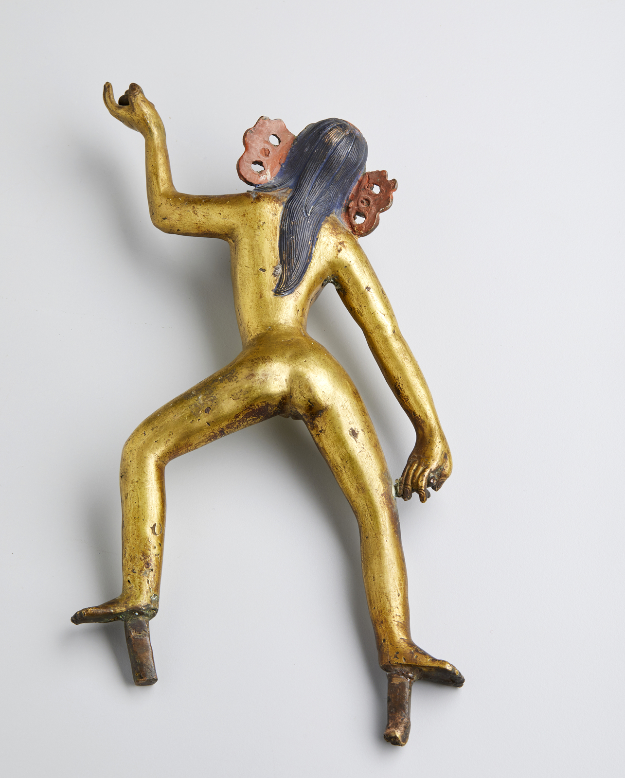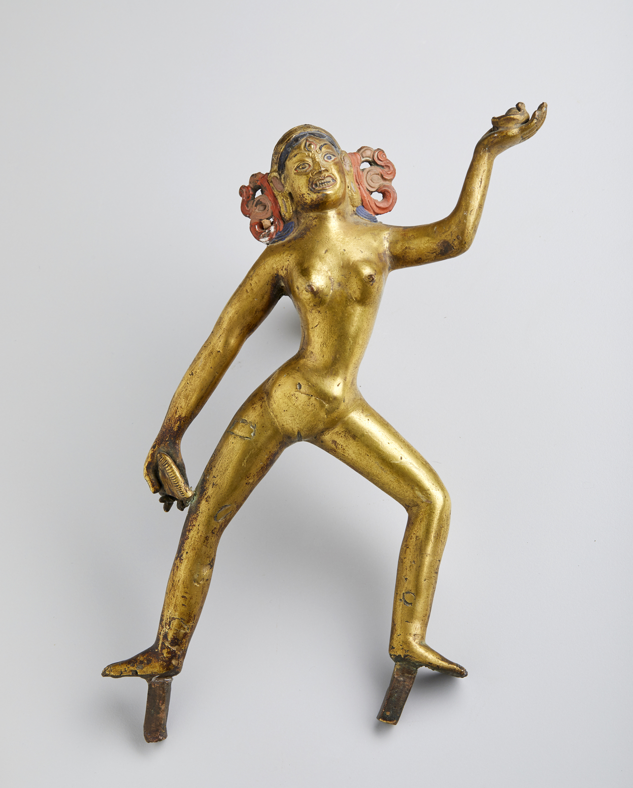 Tibet, XVIII secolo. . Cm 14,00 x 23,50. Fusione in bronzo raffigurante la forma più celebre della Dakini contraddistinta dall'espressione semi-irata, dal terzo occhio, dal passo di danza e dai due attributi: un kattari nella sua mano destra ed una calotta (kapala) contenente il liquido inebriante (amrita) nella sua mano sinistra. Alla figura mancano la prabha infuocata e Kalarati e Bhairava nero sotto i suoi piedi.