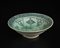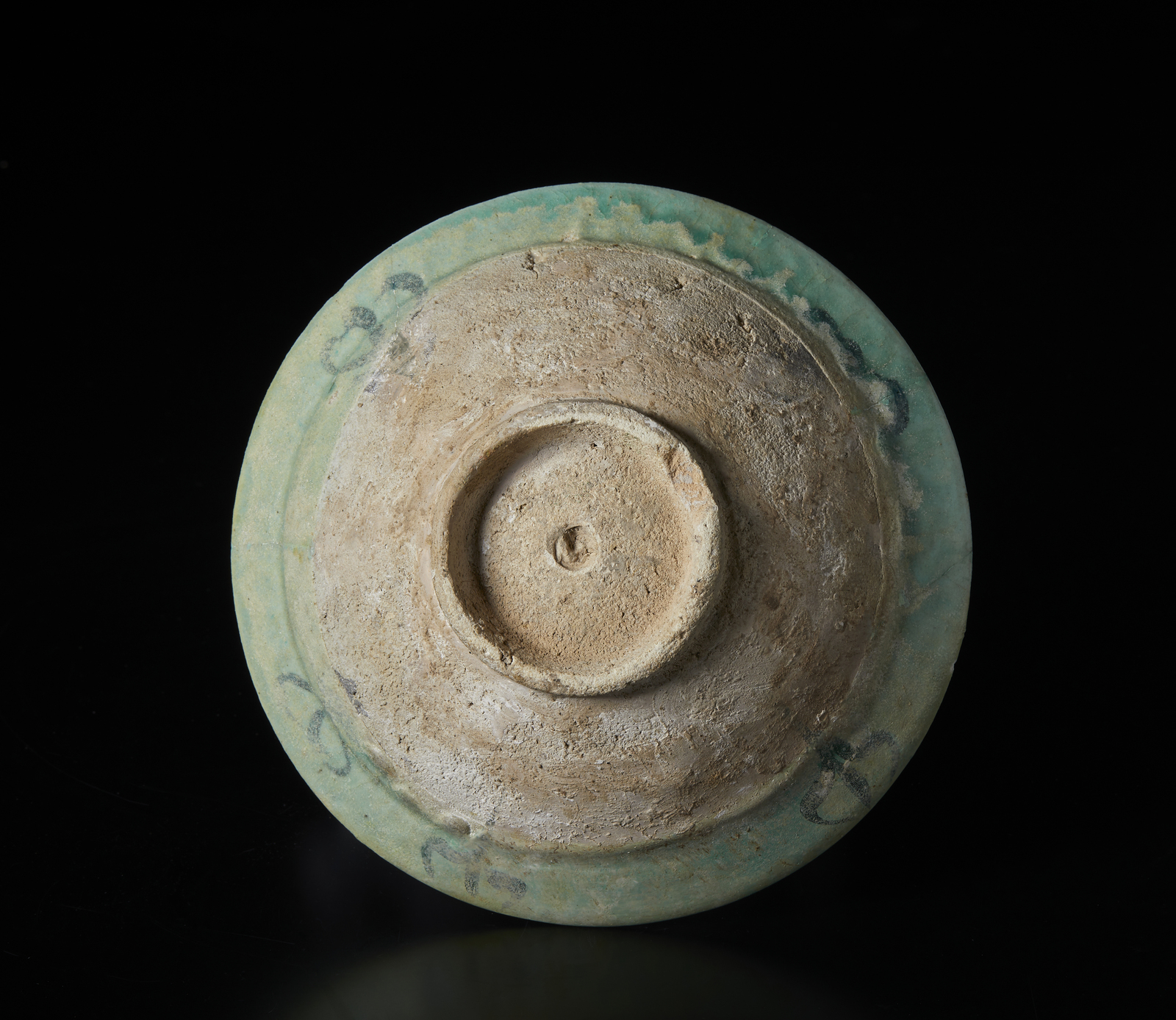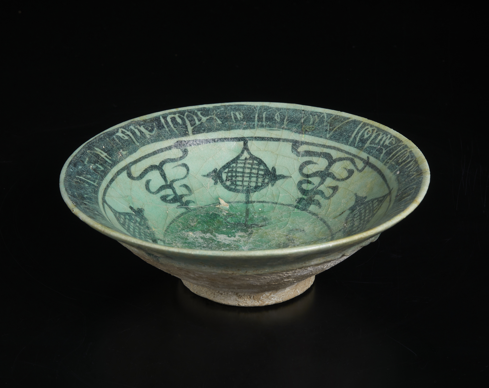 Iran, XII secolo . . Cm 24,00 x 7,50. Ciotola in pasta silicea, l'interno dipinto in nero sotto vetrina turchese con piccoli alberi e piante stilizzate alternati intorno al tondo centrale; il bordo decorato con iscrizione corsiva in riserva su nero.