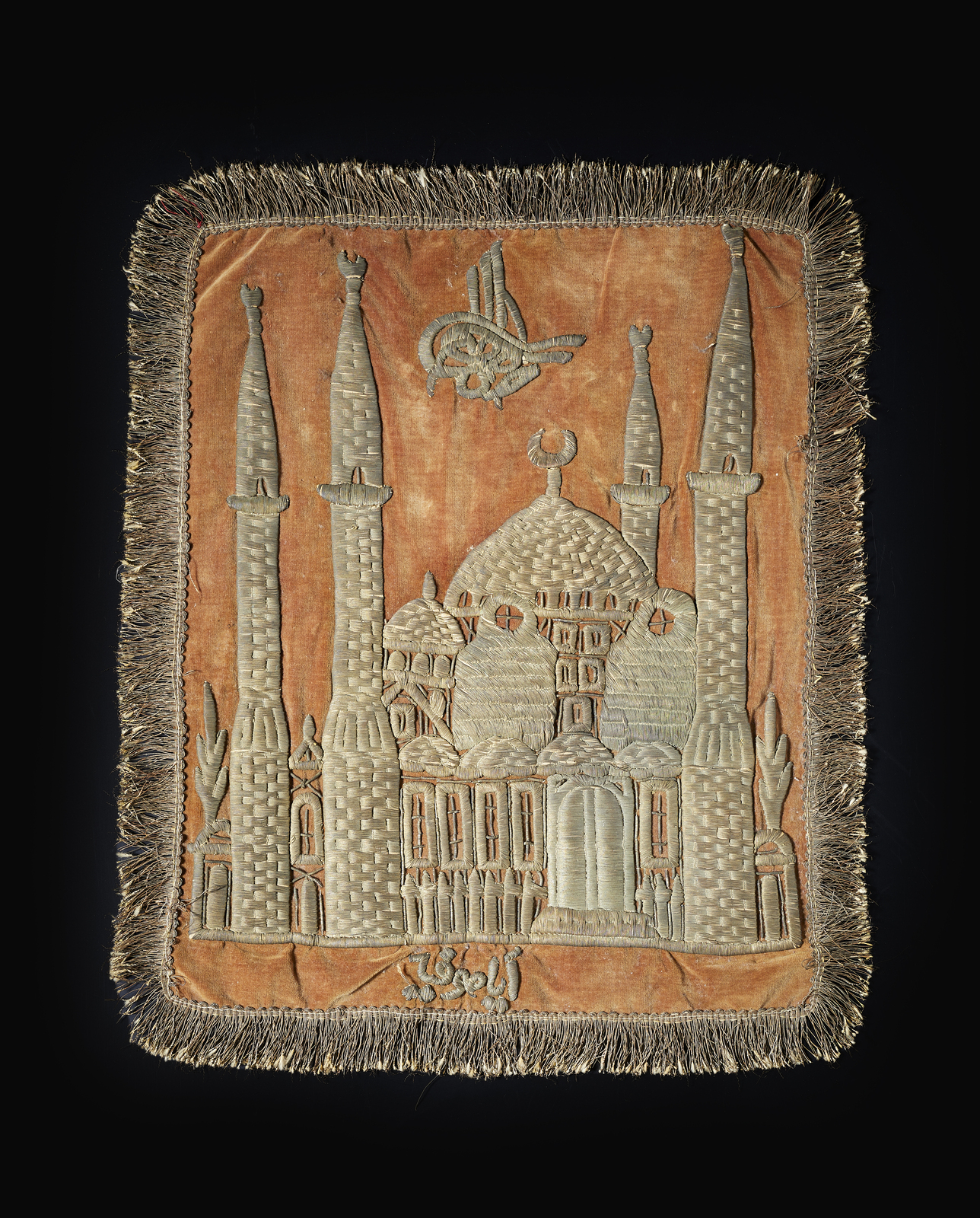 Turchia, XIX secolo . . Cm 40,00 x 40,00. Entrambi ricamati con raffigurazione di moschee: uno su sfondo color ruggine con moschea sormontata da tughra; l'altro su sfondo nero.
