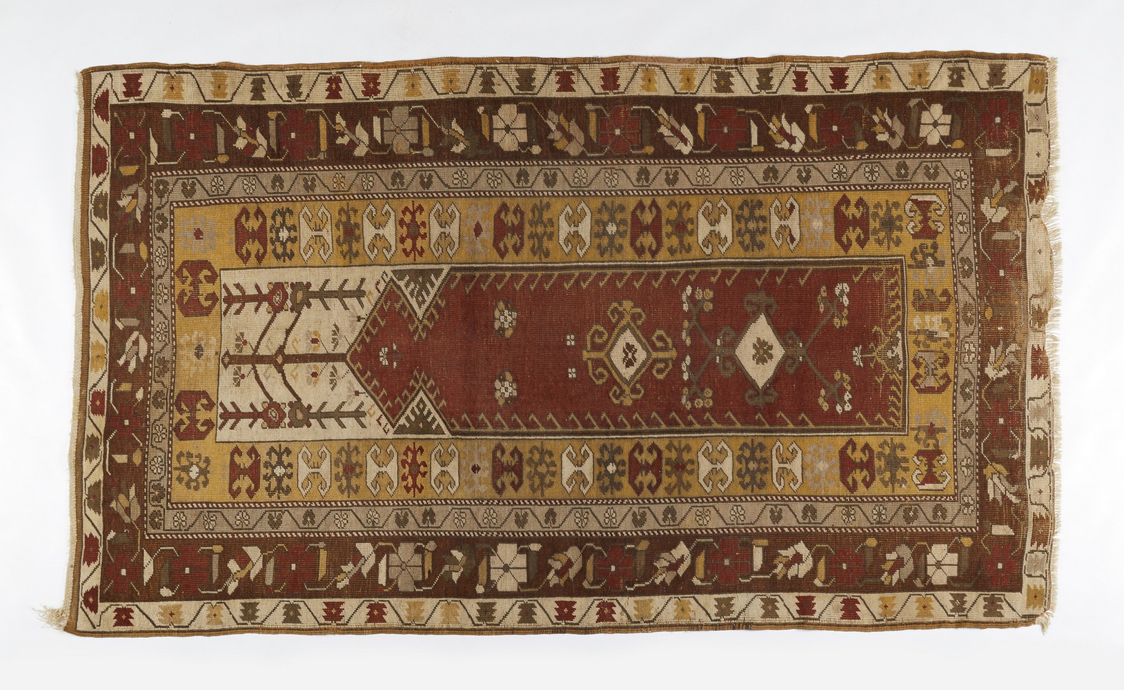 Turchia, Anatolia, 1940-1950. . Cm 120,00 x 212,00. Tappeto in lana con decorazione floreale stilizzata su sfondo nei toni caldi del beige e del marrone. Nicchia centrale in forma di mihrab decorata con losanghe.