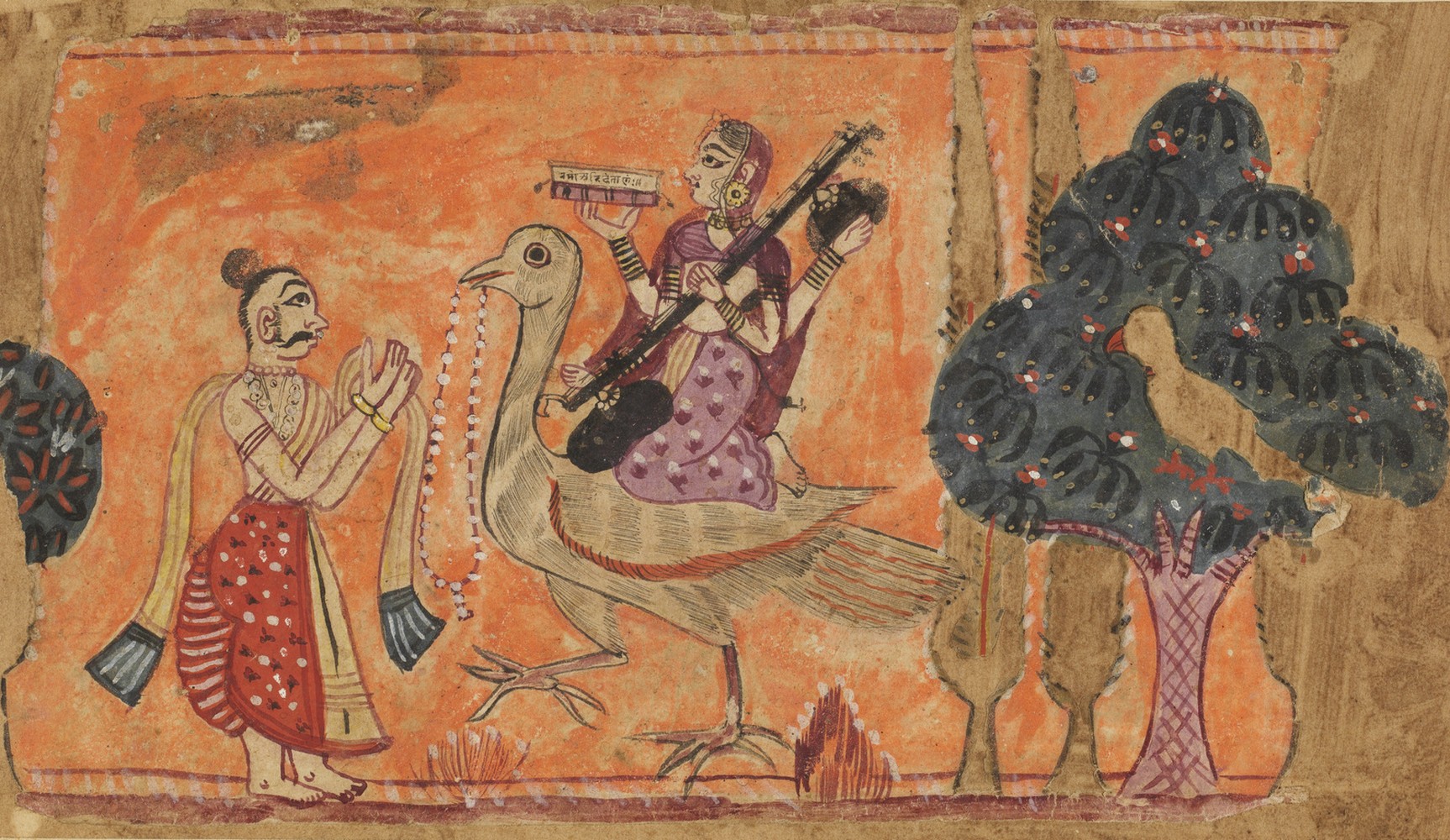Arte Indiana - Miniatura raffigurante Sarasvati sul pavone India Settentrionale, Rajasthan, XIX secolo o antecedente.