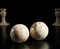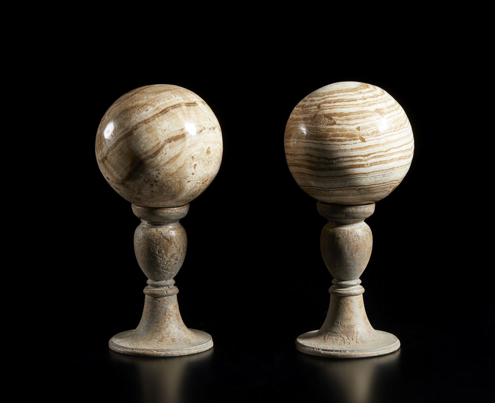 Italia, XX secolo . . Cm 12,50 x 25,00. sfere in marmo onice striato montate su basi in legno tornito