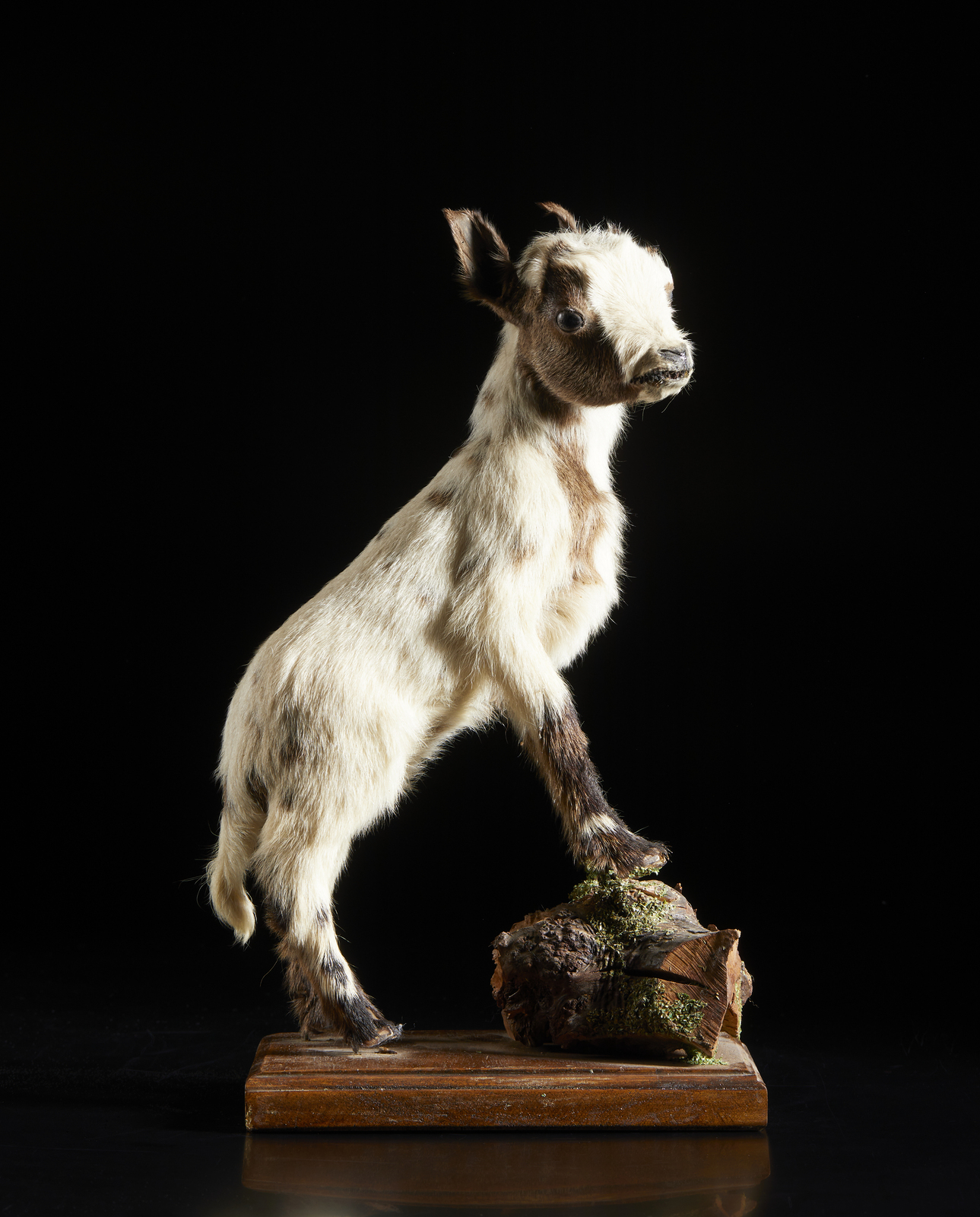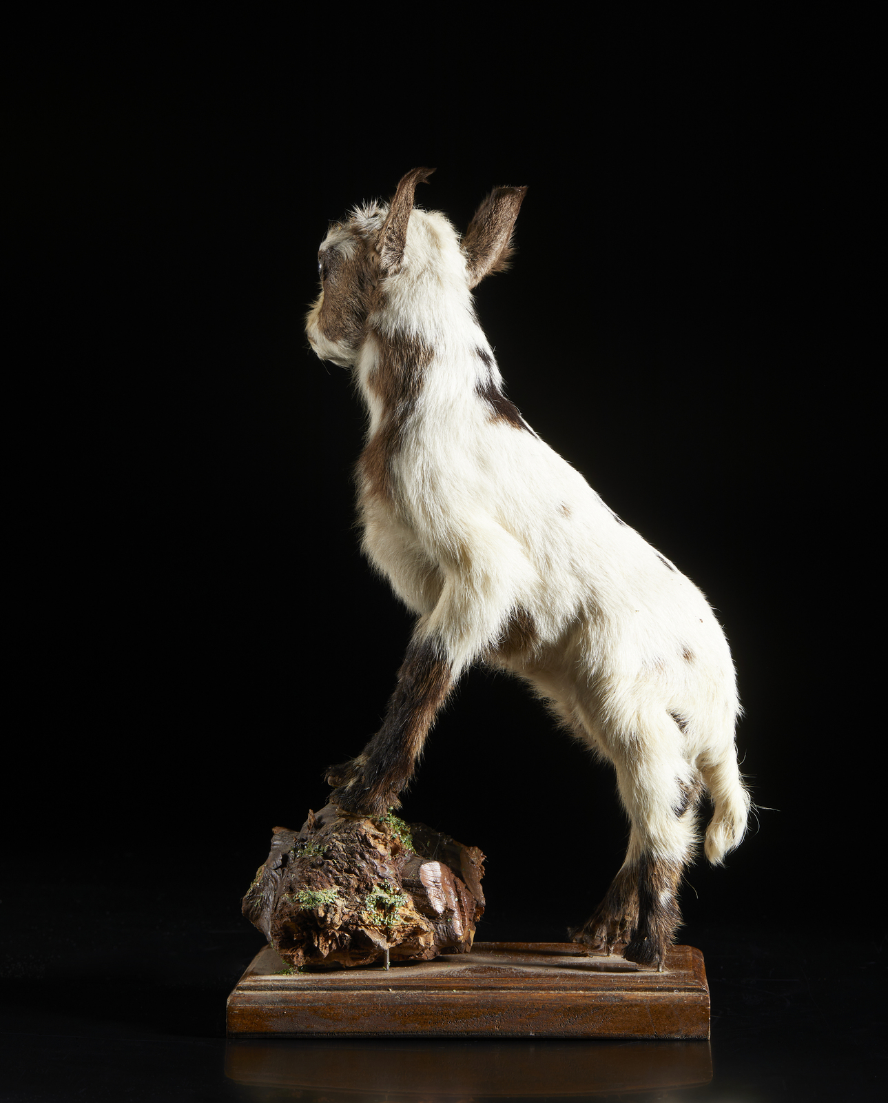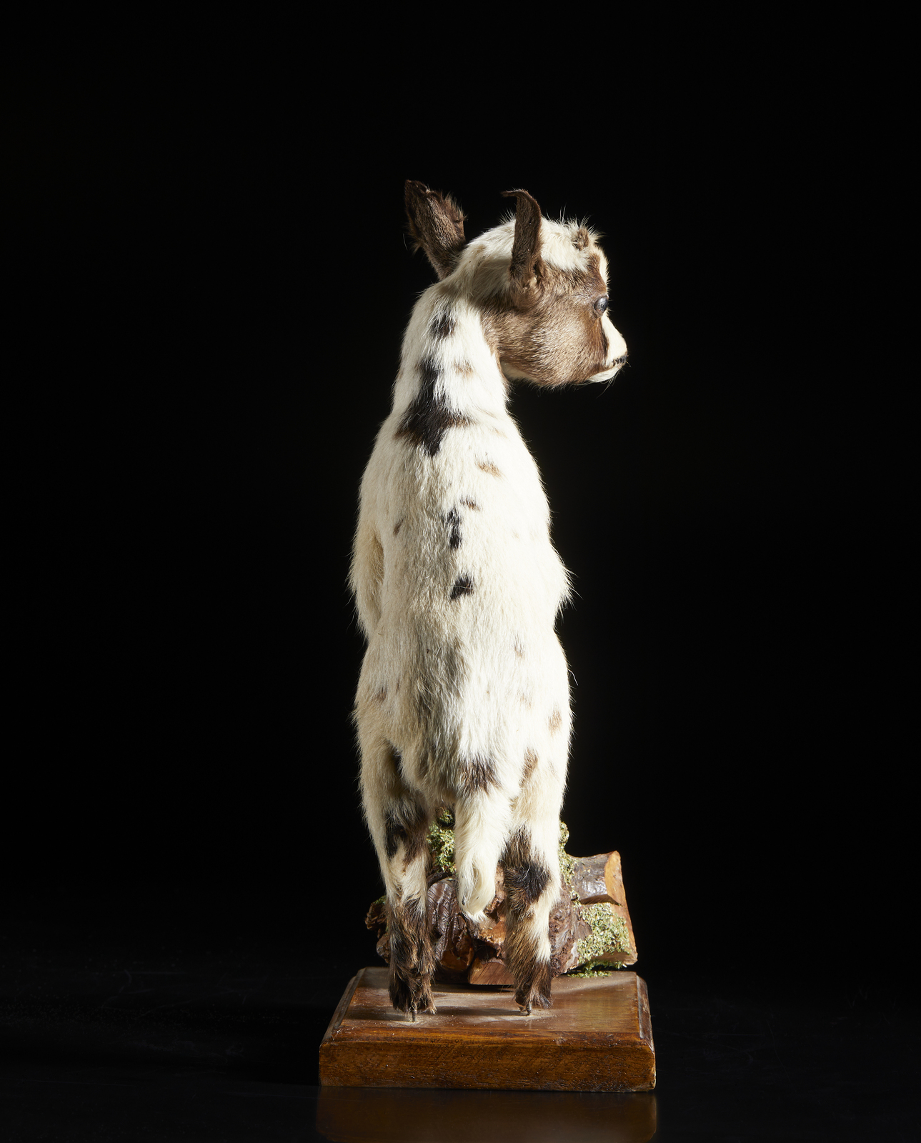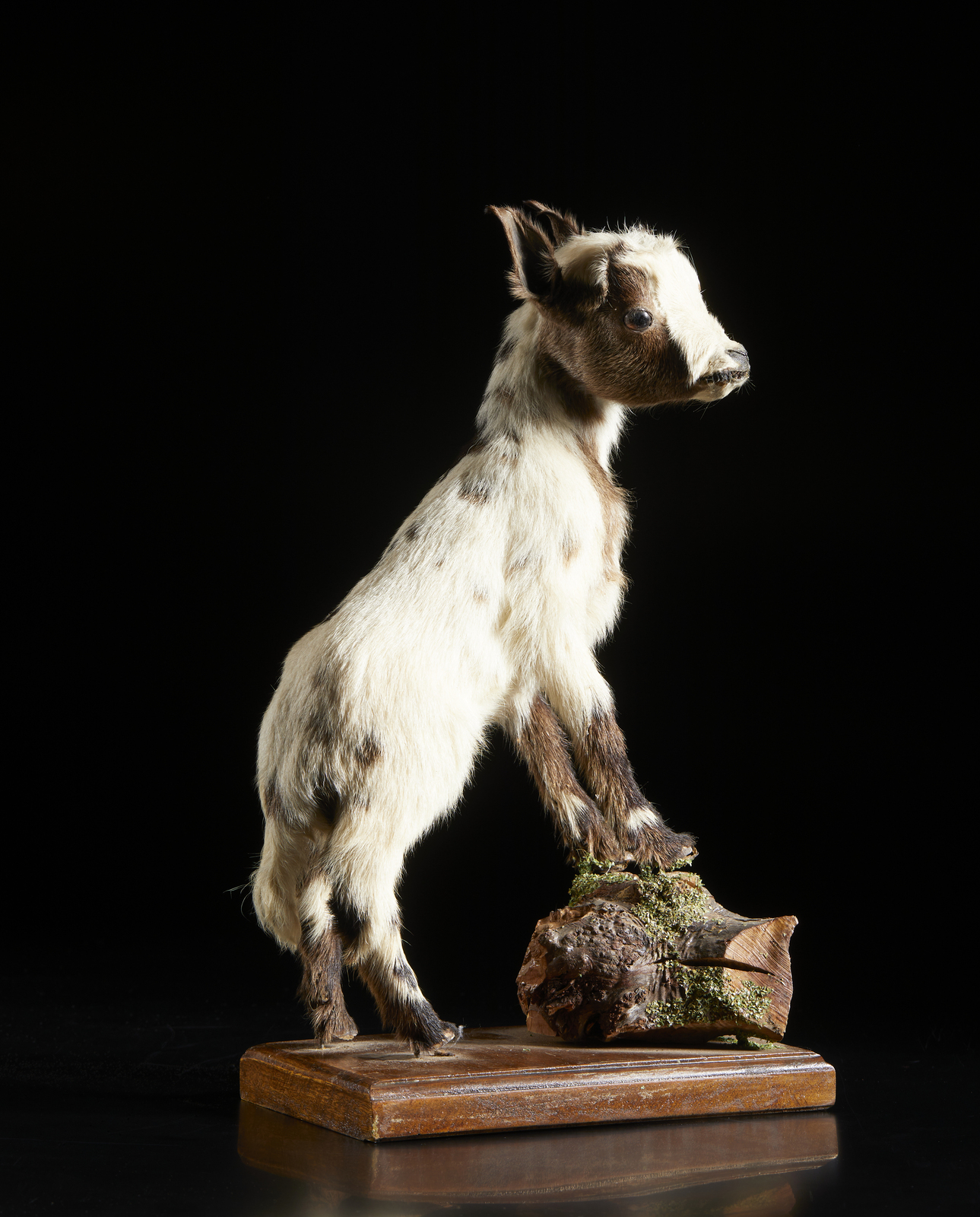 . - Capretta imbalsamata su base in legno Europa. XX secolo.
