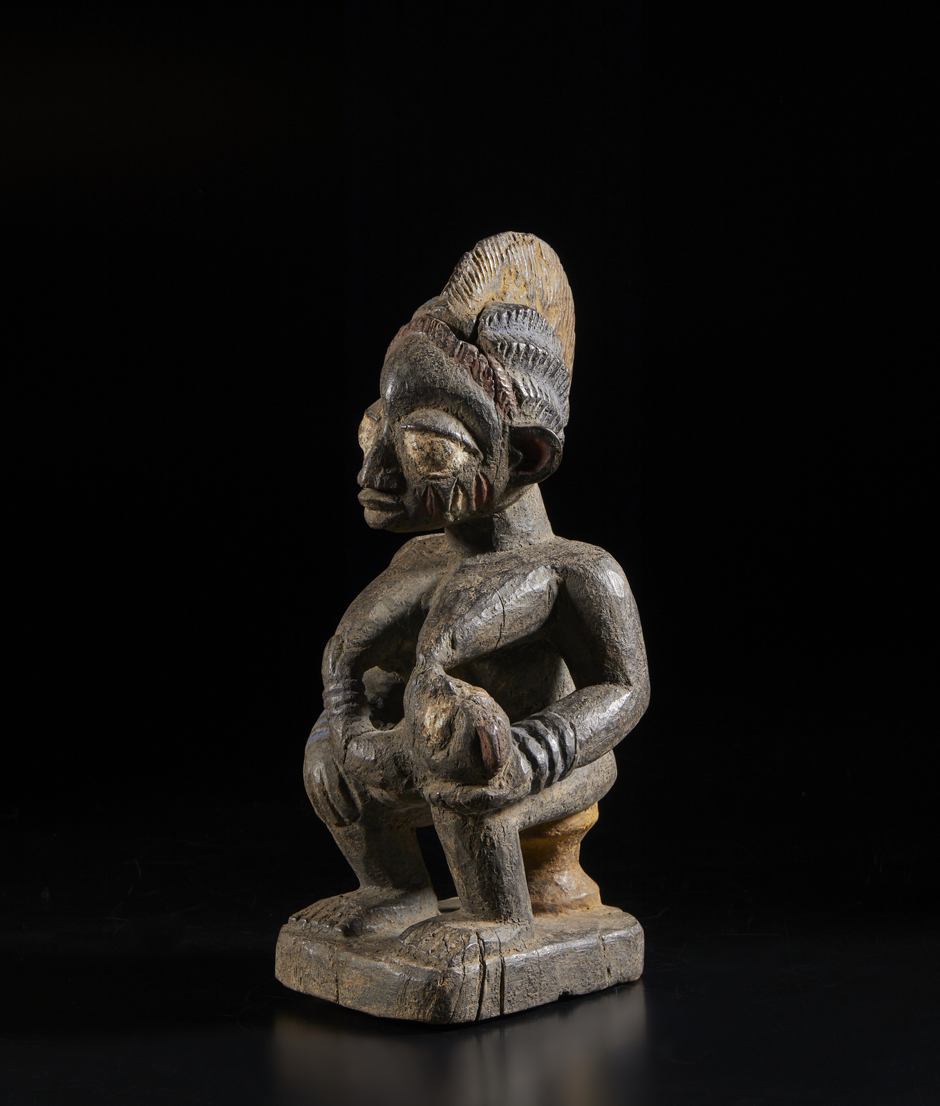 Legno e pigmenti. . Cm 14,00 x 32,00. La statuetta rappresenta una donna seduta in fase di allattamento. Presenze di pigmentazioni tipiche della scultura Yoruba in diverse parti del corpo.
