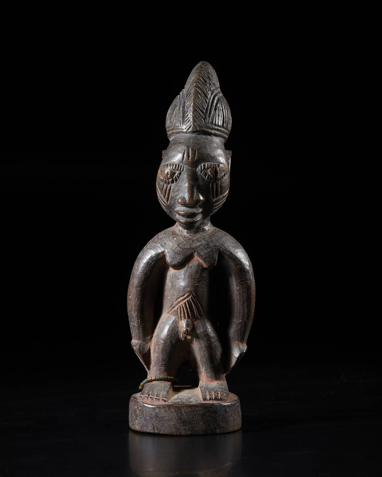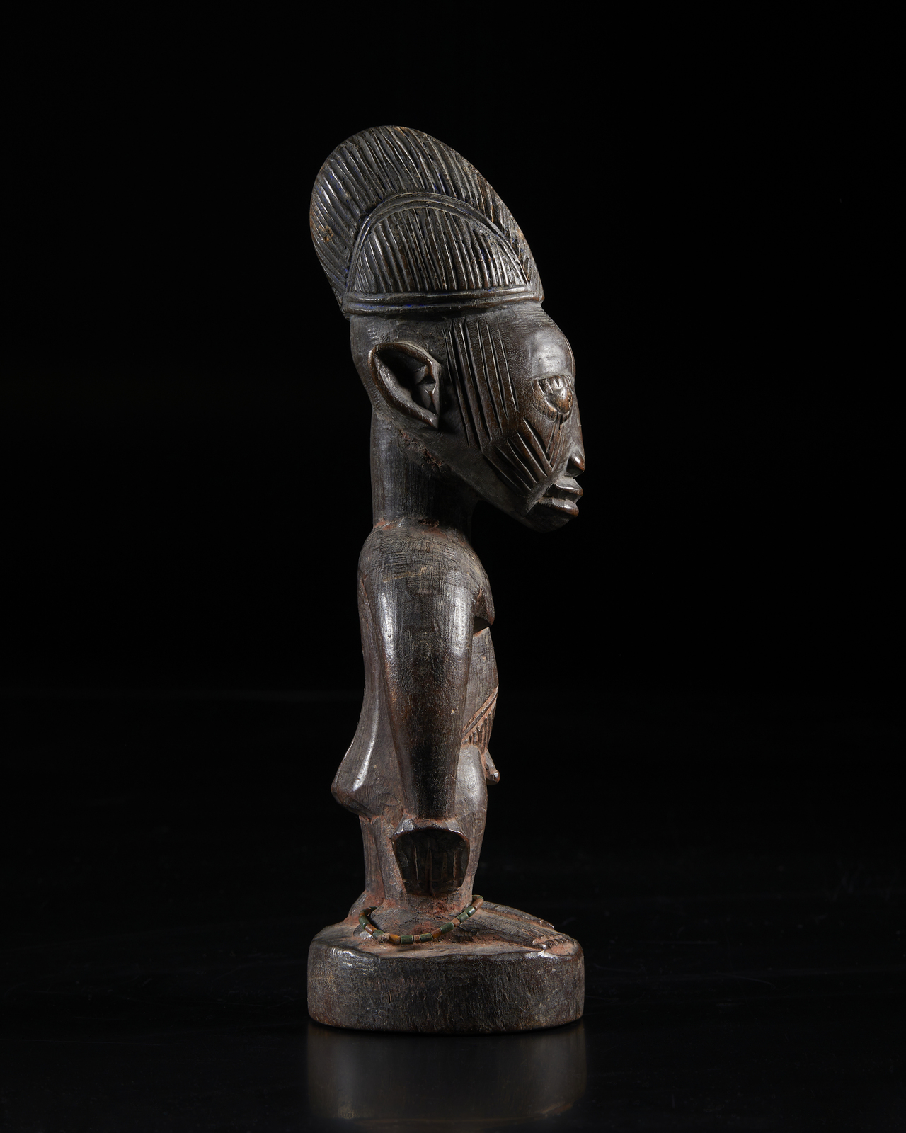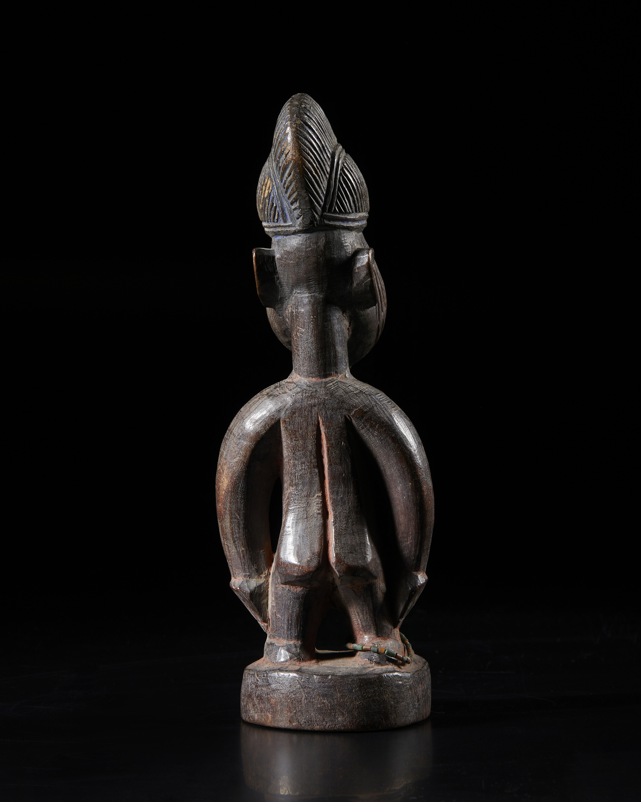 Inizi del XX sec. . . Cm 8,50 x 28,50. Figura di gemello ibeji con abbondanti tracce di tukula polvere rossa e blu cobalto nell'acconciatura, usate come protettive e cosmetiche.