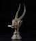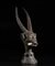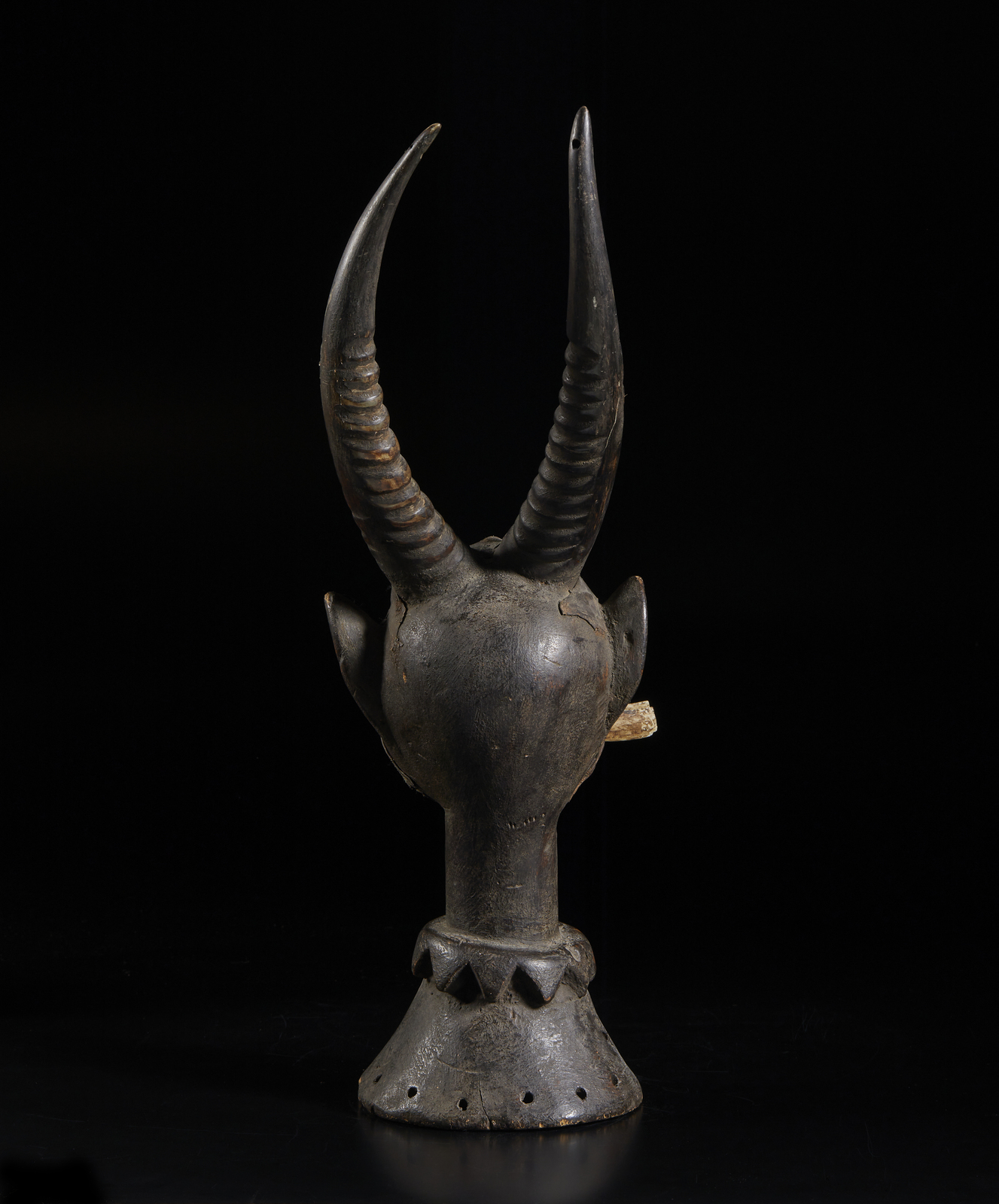 Segni d'uso. . Cm 20,50 x 63,50. Il viso è ricoperto di pelle, le corna sono di antilope; tra i denti stringe una costola di animale.