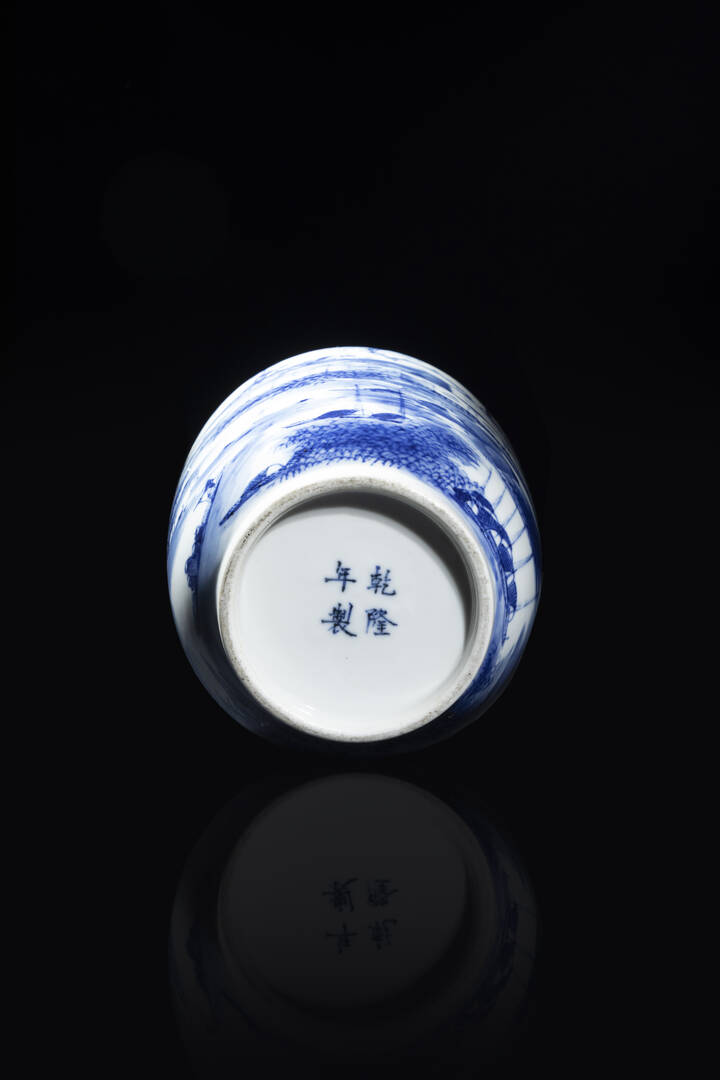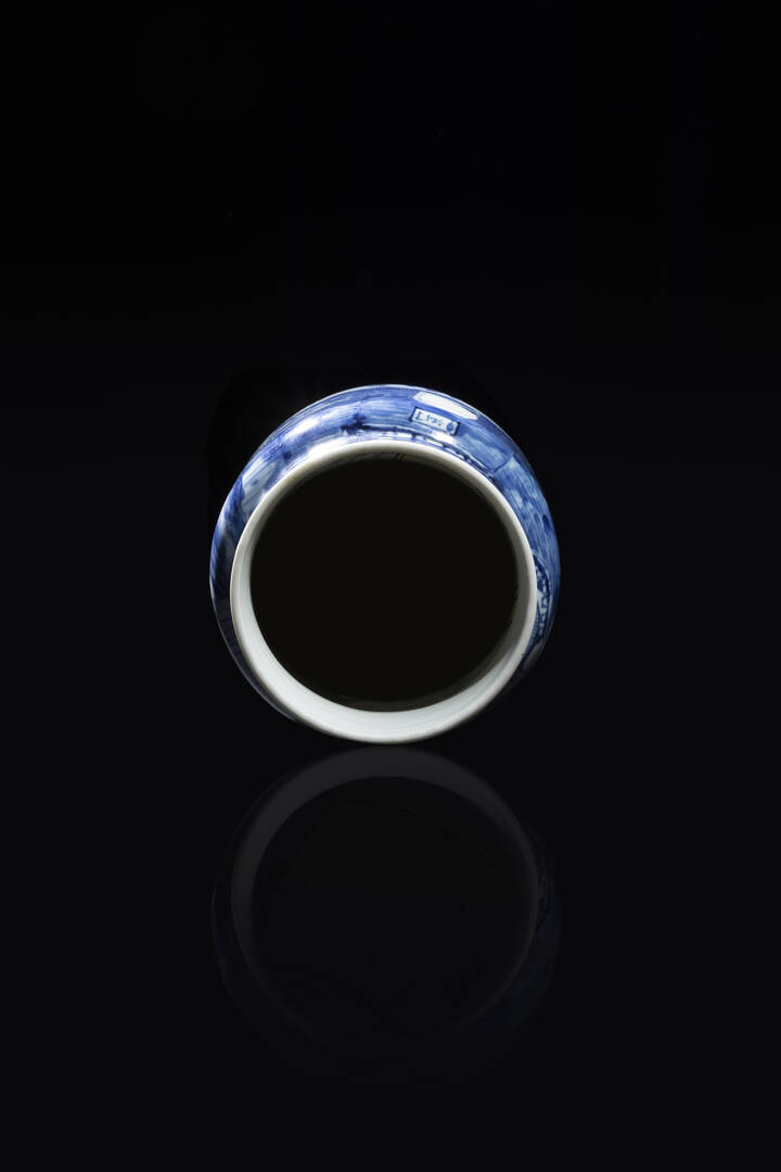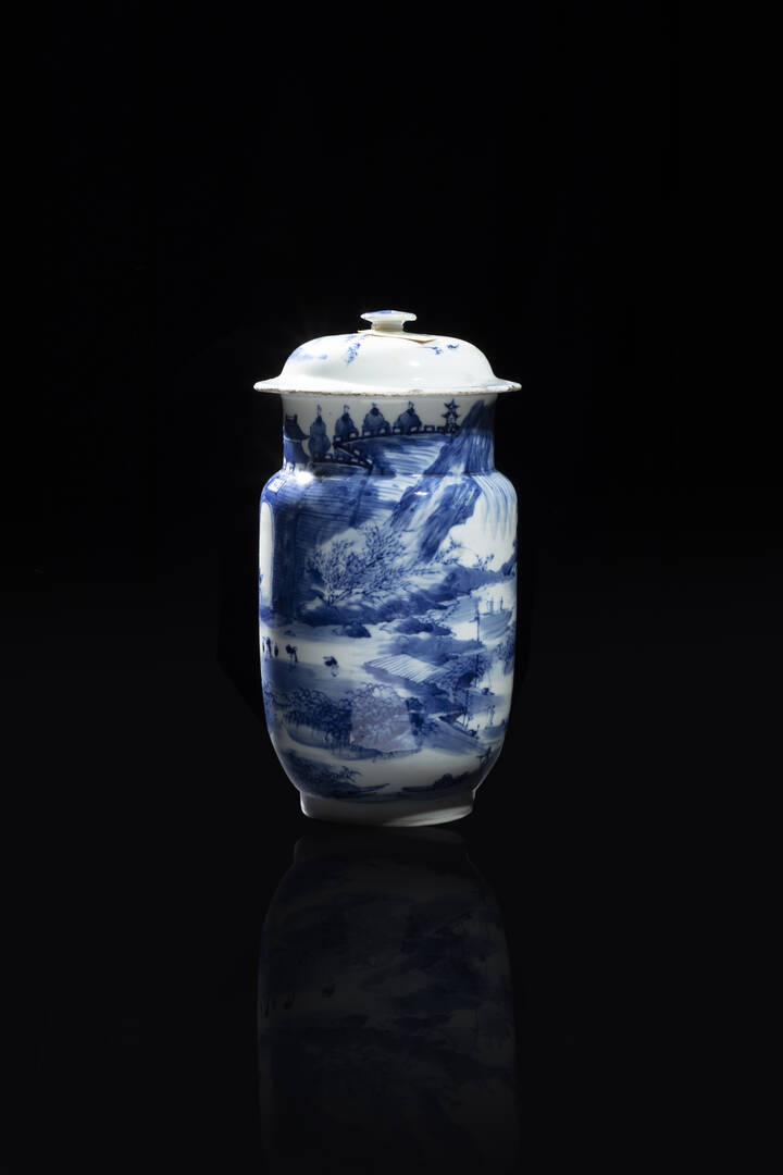 Vaso in porcellana bianco e blu con coperchio, dipinto con scene di paesaggio, Cina, Repubblica, XX sec.