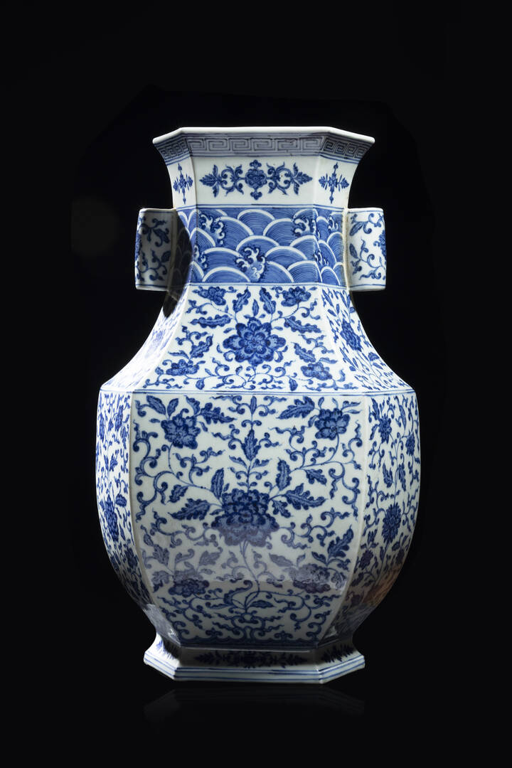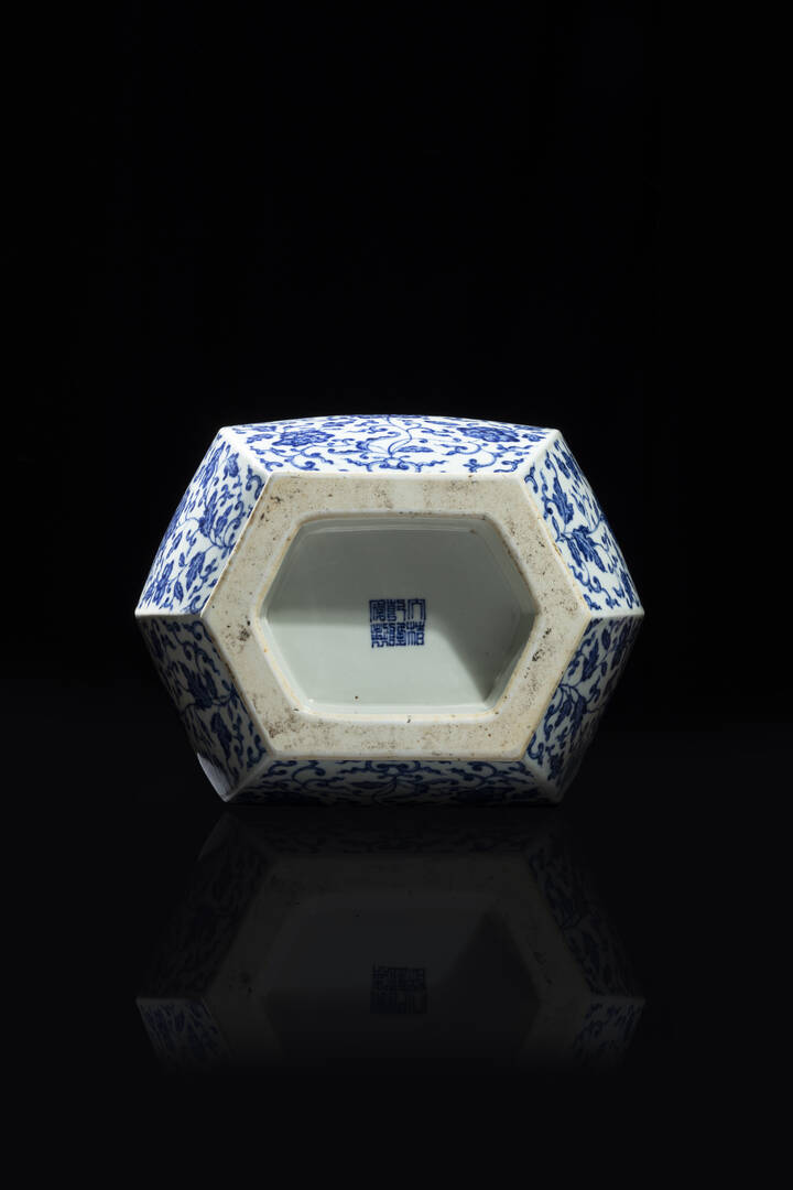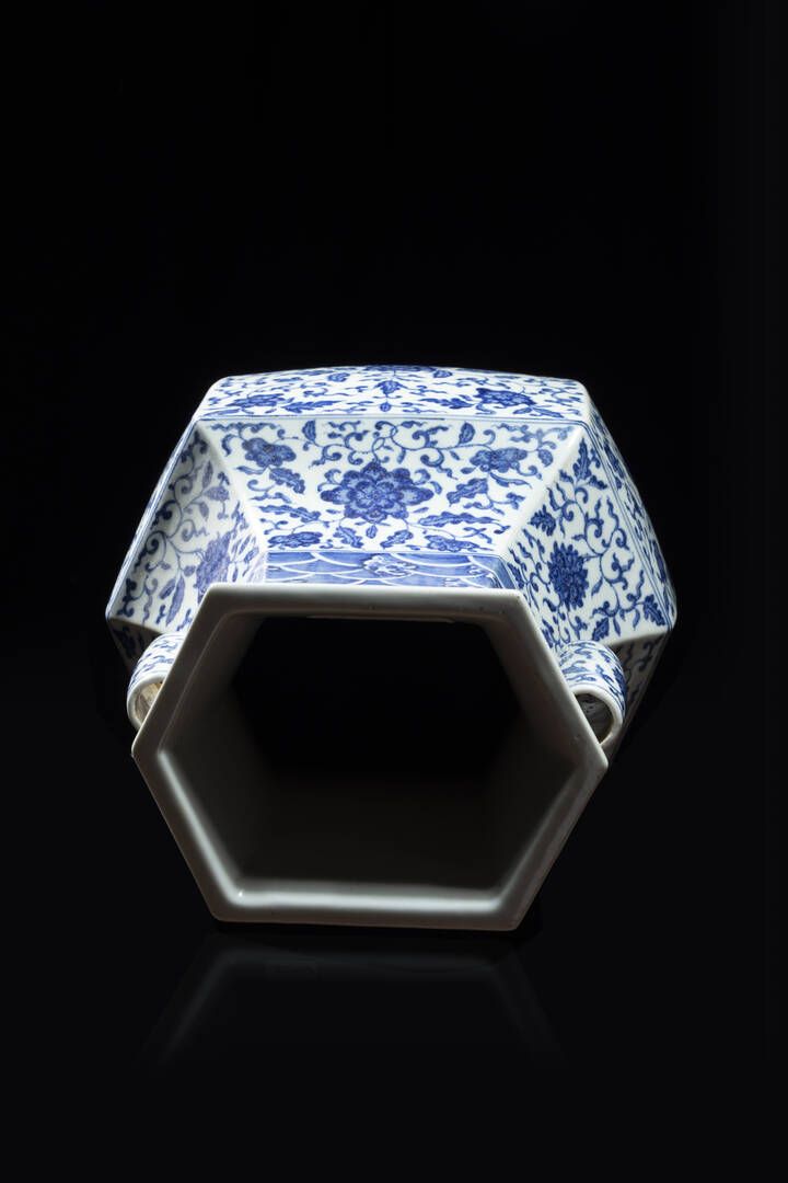 Vaso esagonale in porcellana bianco e blu con decori floreali, Cina, dinastia Qing, XX sec.