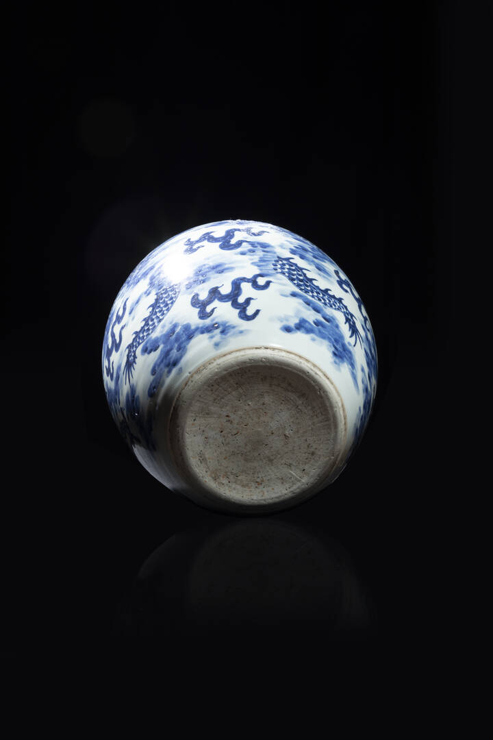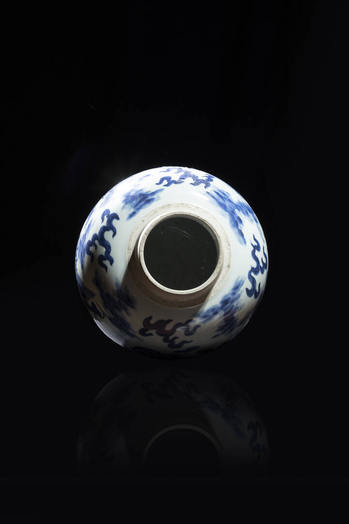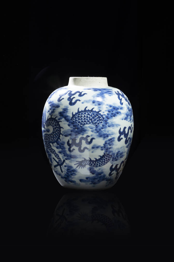 Vaso in porcellana bianco e blu dipinto con draghi tra le nuvole, Cina, dinastia Qing, XIX sec.
