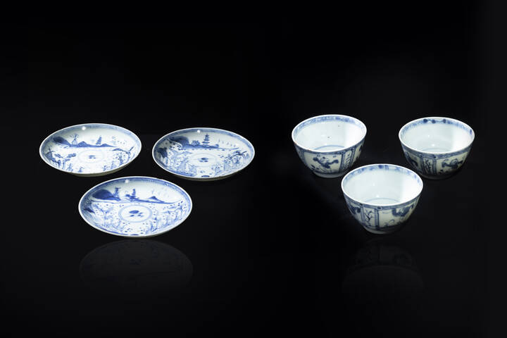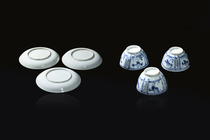 Tre tazzine con piatto in porcellana, decorate con scene di paesaggi e bambini, Cina, dinastia Qing, XVIII sec