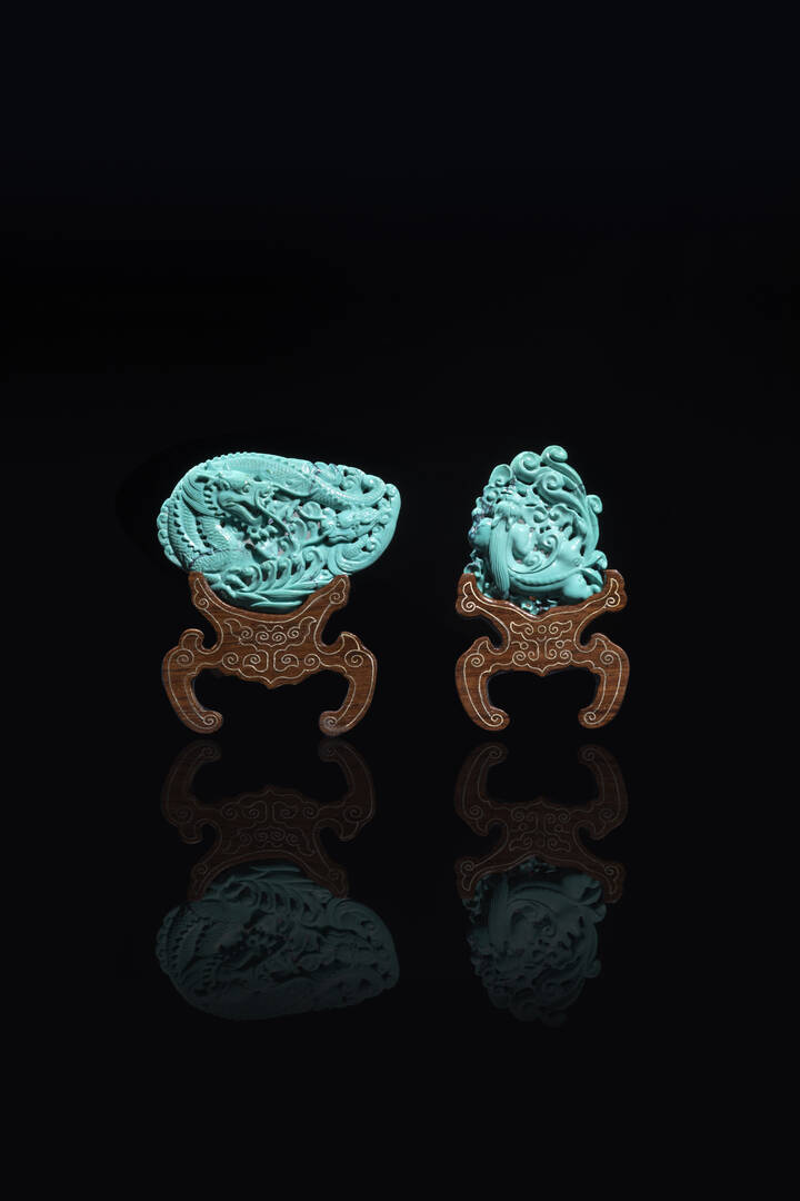 Coppia di ciondoli in turchese scolpiti con draghi tra le onde, Cina, Repubblica, XX sec
