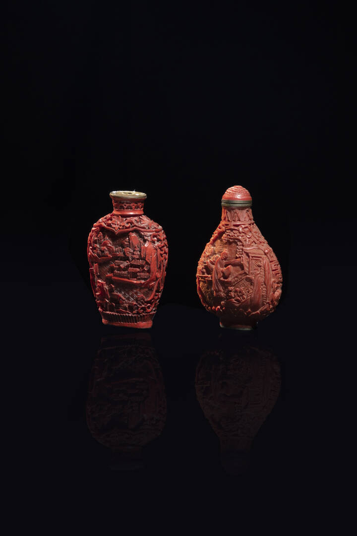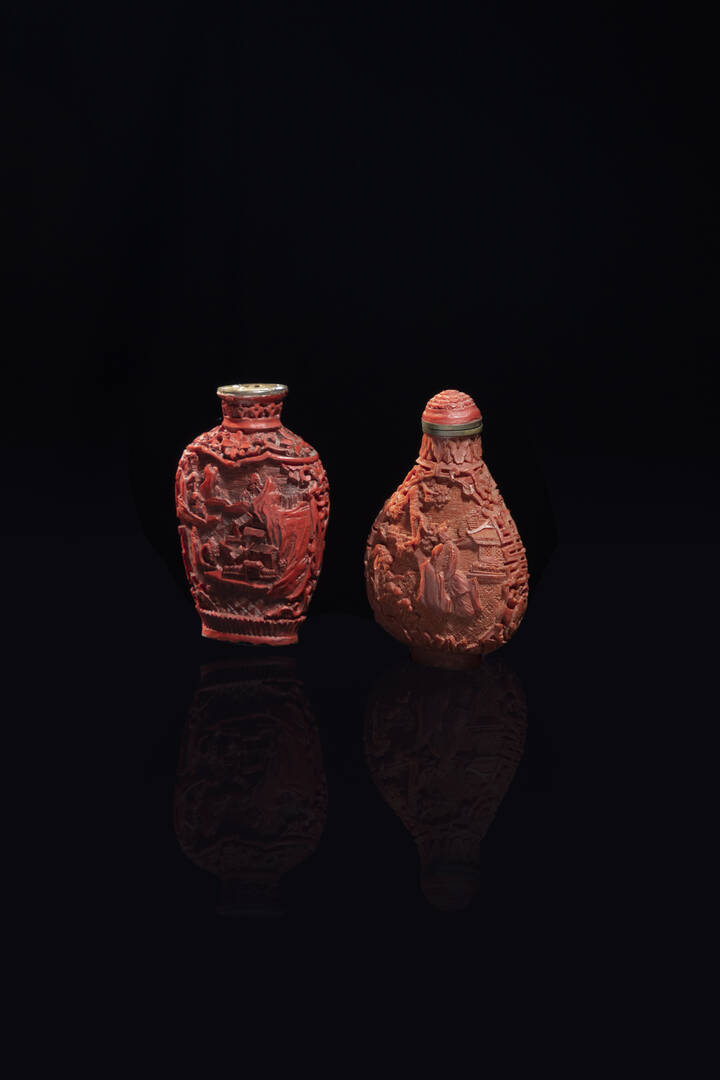 Coppia di snuff bottle in lacca con paesaggi e figure, Cina, dinastia Qing, XIX sec