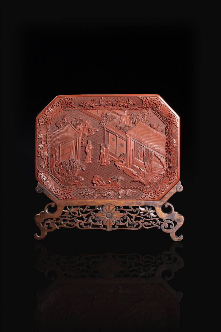 Vassoio in lacca intarsiato con scene di corte, Cina, dinastia Qing, XIX sec