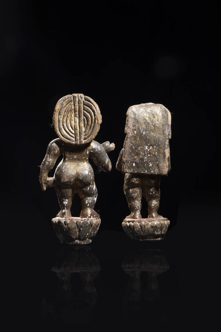 Coppia di sculture di divinità in legno dorato, sud est asiatico, "Bali", XIX sec