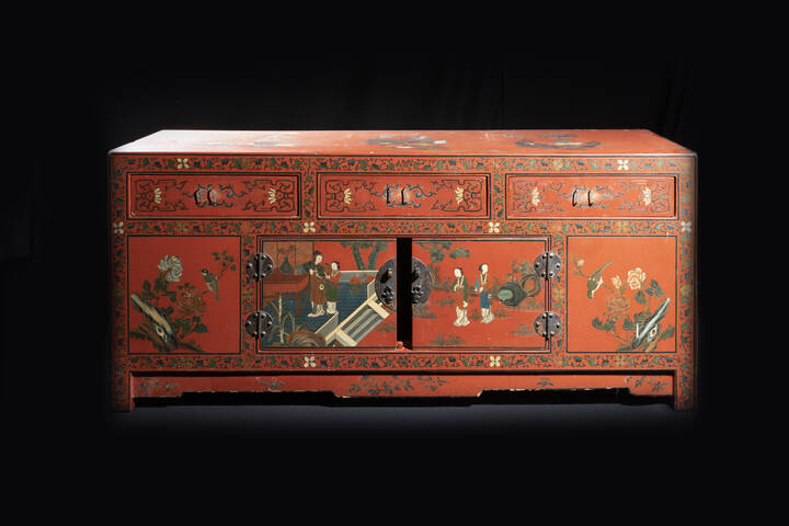 Mobiletto in lacca rossa dipinto con figure entro paesaggio (uccelli e vasi), Cina, Repubblica, XX sec.