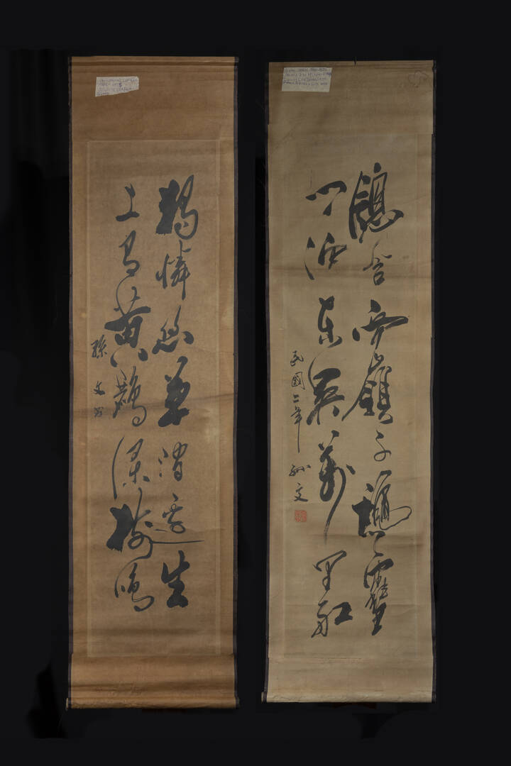 Coppia di scroll su pergamena raffiguranti iscrizioni, Cina, dinastia Qing, XIX sec.