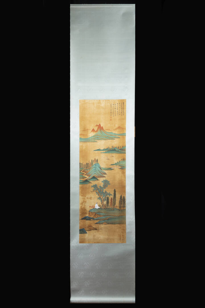 Dipinto su seta raffigurante figura entro paesaggio e iscrizioni, Cina, Repubblica, XX sec.