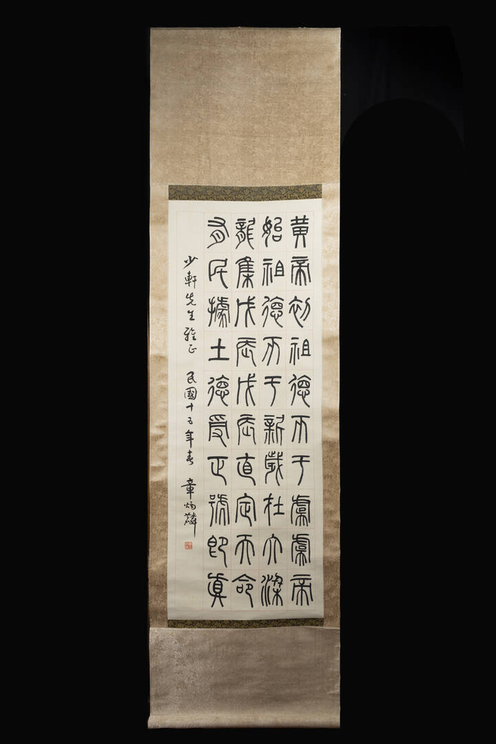 Dipinto su pergamena con iscrizioni arcaiche, Cina, Repubblica, XX sec.