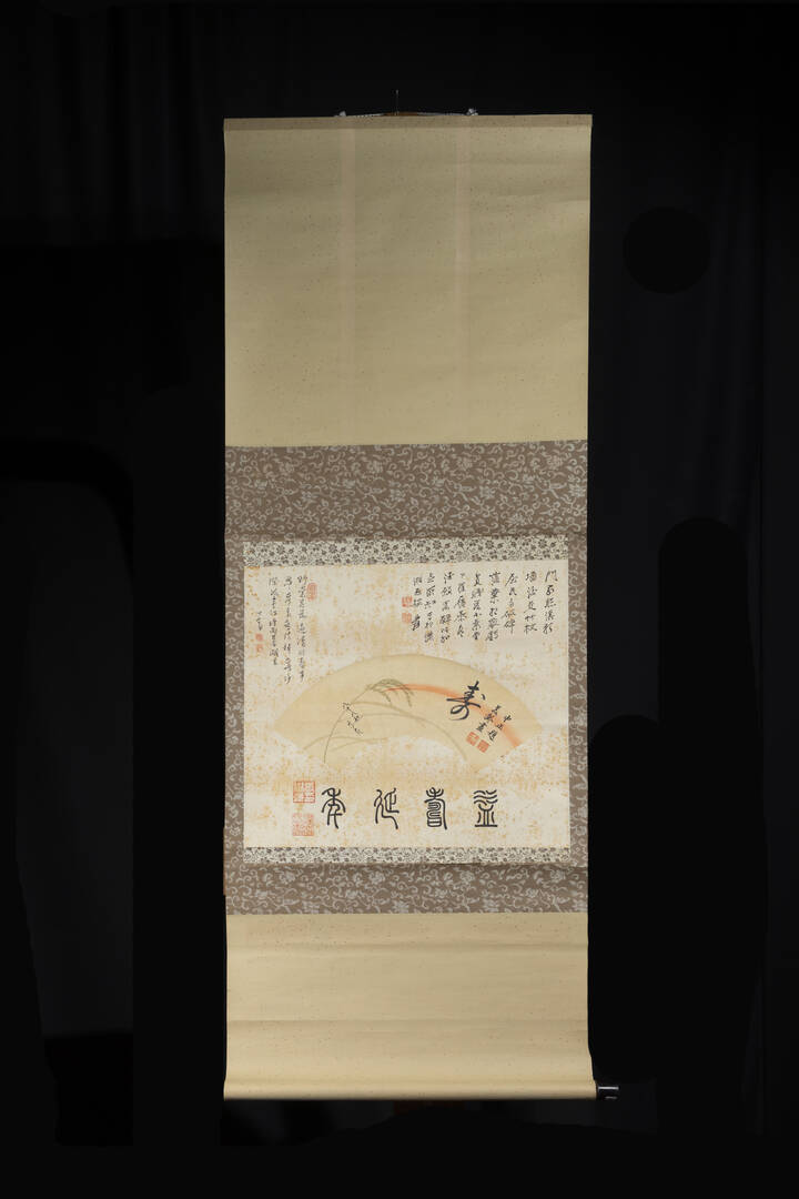 Dipinto su pergamena con iscrizioni e ventaglio, Cina, Repubblica XX sec