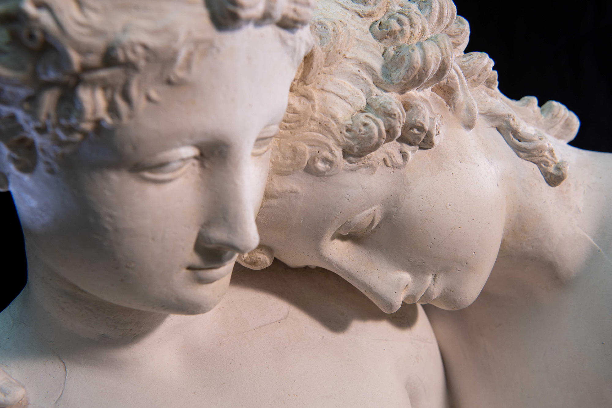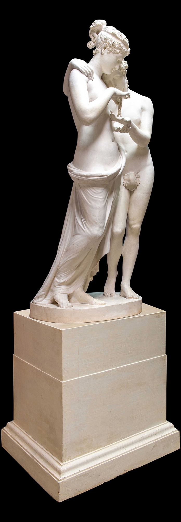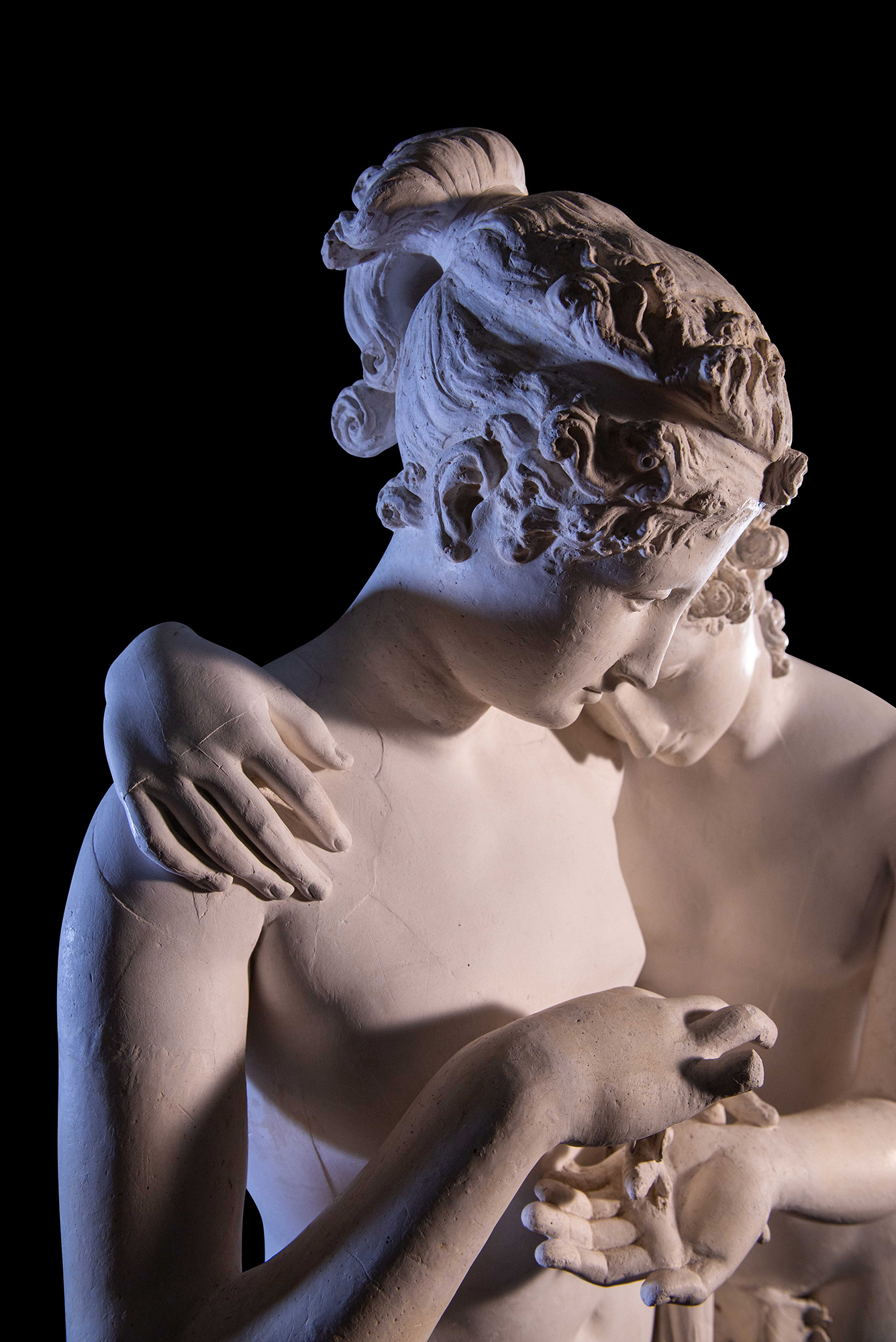 Canova ha certamente molto caro il tema di Amore e Psiche, che realizza in quattro marmi tra il 1787 e 1803, due con le figure abbracciate e due con le figure in piedi una a fianco all’altra, ossia stanti, come nel nostro gesso. Al primo gruppo «di carattere assai caldo e appassionato» si contrappone, a partire dal 1797, forse quale riflessione su un modello statuario antico di Amore e Psiche conservato al Campidoglio e agli Uffizi, il secondo gruppo, in cui l’amore assume valore spirituale e platonico (definizione di Canova: cfr. A. Muñoz, Antonio Canova. Le opere, Roma, 1957, p. 58). Il committente è, in entrambi i casi, prestigioso – il collezionista inglese John Campbell – e le opere, in rapidi cambi di mano, conquistano le sale più prestigiose d’Europa: Gioacchino Murat ne acquista una per tipo destinandole al castello di Villiers-la-Garenne – si tratta delle sculture oggi al Louvre –; l’Imperatrice Josephine de Beauharnais, moglie di Napoleone, compra le altre due per cederle nel 1815 allo Zar Alessandro I di Russia, e queste sono oggi conservate all’Hermitage.