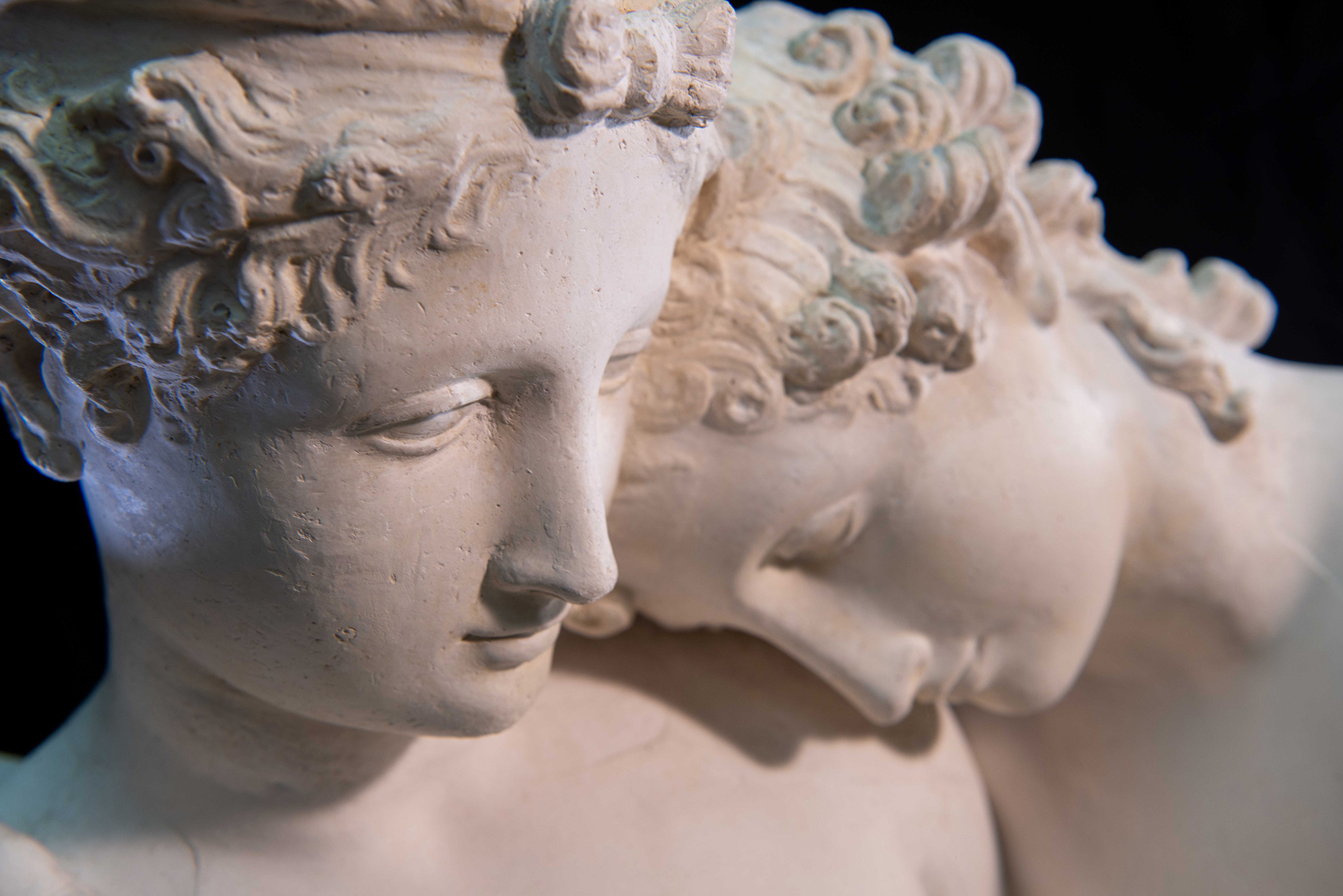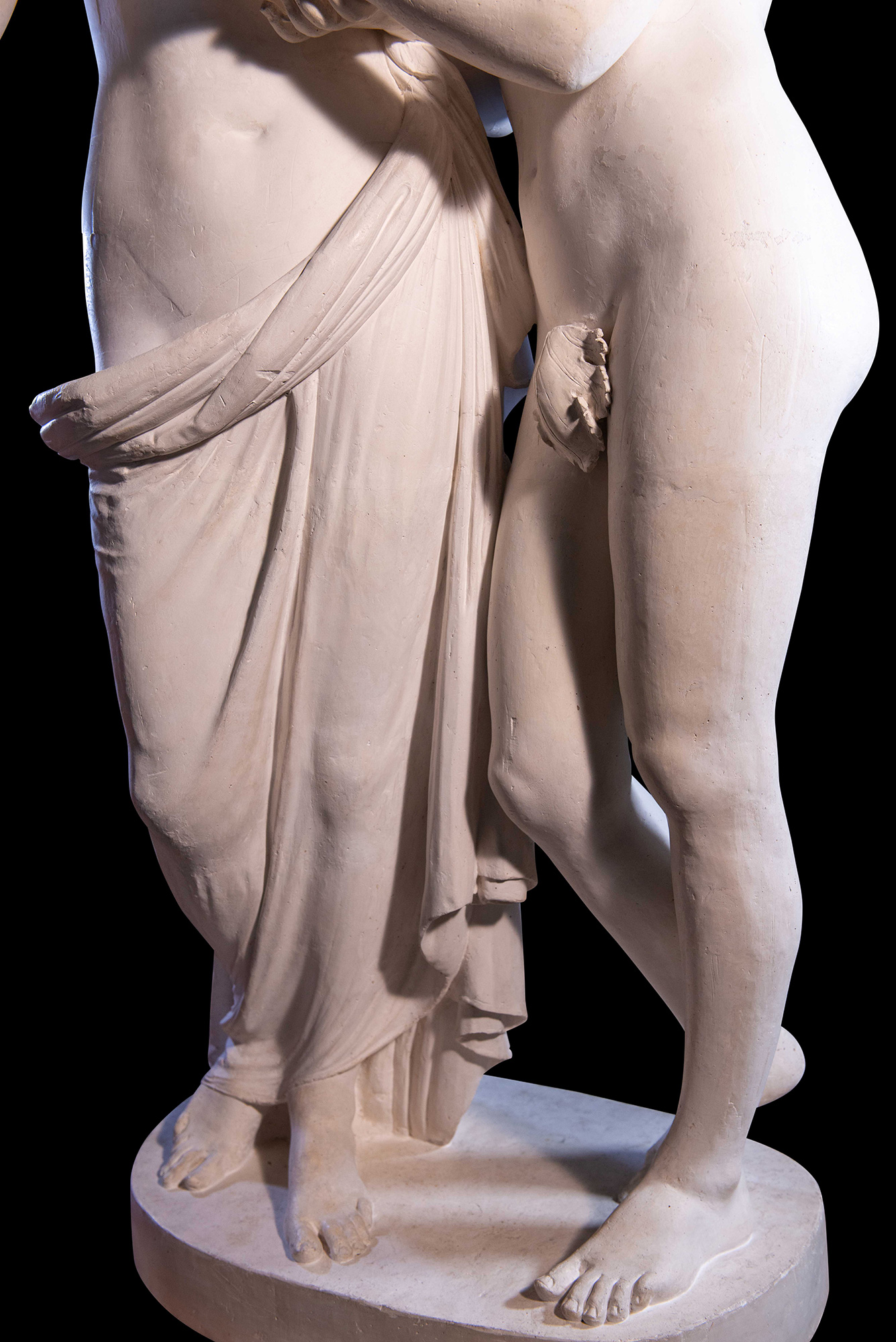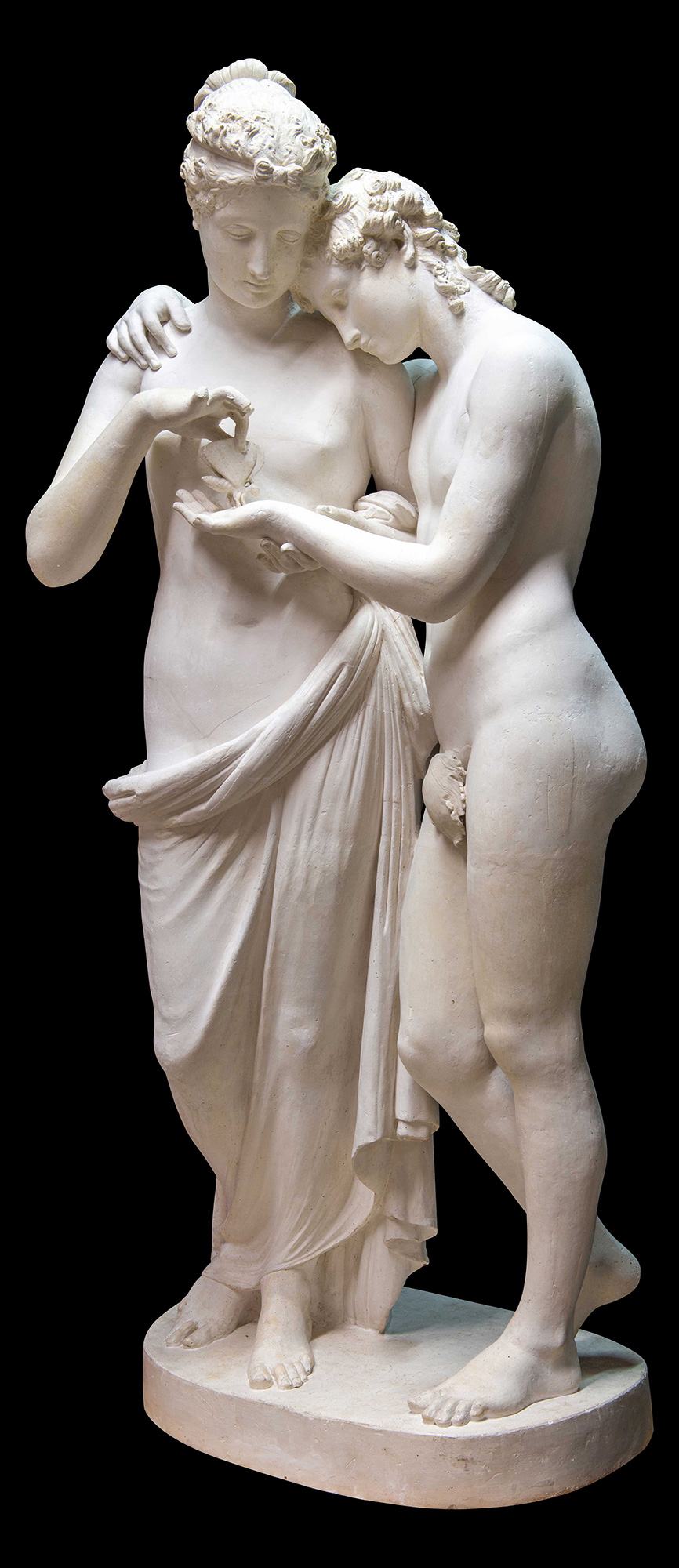 Canova ha certamente molto caro il tema di Amore e Psiche, che realizza in quattro marmi tra il 1787 e 1803, due con le figure abbracciate e due con le figure in piedi una a fianco all’altra, ossia stanti, come nel nostro gesso. Al primo gruppo «di carattere assai caldo e appassionato» si contrappone, a partire dal 1797, forse quale riflessione su un modello statuario antico di Amore e Psiche conservato al Campidoglio e agli Uffizi, il secondo gruppo, in cui l’amore assume valore spirituale e platonico (definizione di Canova: cfr. A. Muñoz, Antonio Canova. Le opere, Roma, 1957, p. 58). Il committente è, in entrambi i casi, prestigioso – il collezionista inglese John Campbell – e le opere, in rapidi cambi di mano, conquistano le sale più prestigiose d’Europa: Gioacchino Murat ne acquista una per tipo destinandole al castello di Villiers-la-Garenne – si tratta delle sculture oggi al Louvre –; l’Imperatrice Josephine de Beauharnais, moglie di Napoleone, compra le altre due per cederle nel 1815 allo Zar Alessandro I di Russia, e queste sono oggi conservate all’Hermitage.