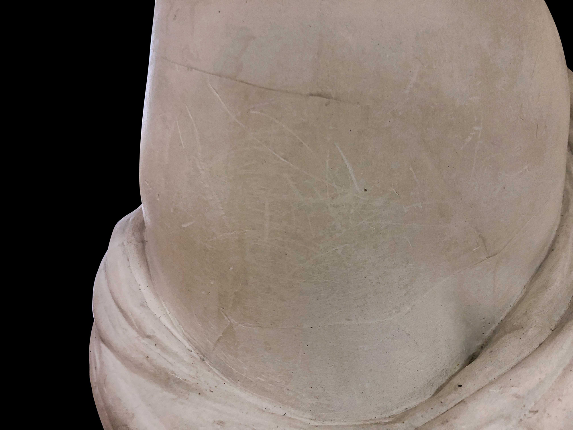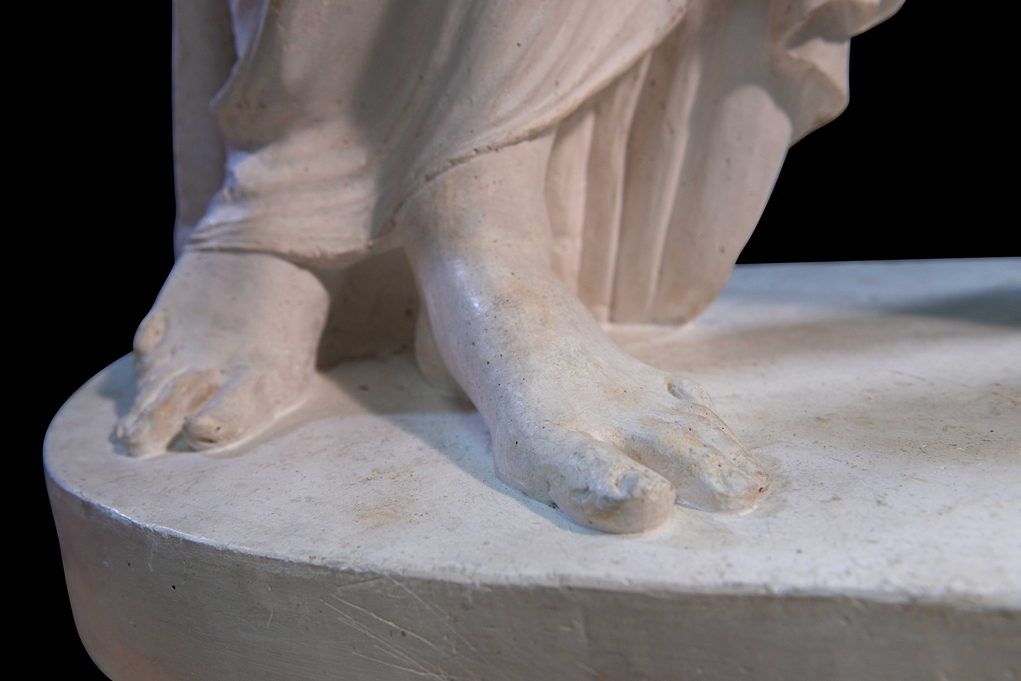 In entrambi i casi, ai gessini di Canova – ben noti sono Vincenzo Malpieri e Giuseppe Torrenti , cui in bibliografia è ricondotto il gesso in asta (Canova 2014, Il, pp. 405, 408, 413; Pavanello 2019) in alternativa ad altri aiutanti (Canova Genio Europeo 2022) – era affidato il compito di realizzare il gesso dagli stampi, per così dire prendendo in mano la produzione materiale di una invenzione che restava, invece, esclusivamente canoviana e costituiva il centro degli interessi artistici del maestro (Lettera al Duca di Miranda del 13 novembre 1801, in Fardella 2002, pp. 85-87; Pavanello 2019, p. 39, n. 21). Un po’ come, più recentemente, è avvenuto per le serigrafie su tela di Andy Warhol. Ed in questo caso proprio la condizione degli stampi – che si riflette (letteralmente) nella resa dei dettagli del calco (G. Pavanello, Collezioni di gessi canoviani in età neoclassica: Padova, in Arte in Friuli. Arte a Trieste, nn. 12-13, 1993, p. 105; Honour 2007, p. 14) – ci consente di spostare la produzione del gesso di Veneto Banca più avanti nei primi due decenni del XIX secolo, il che forse spiega anche perché esso sia rimasto presso lo studio, dove la funzione di conservazione del progetto era già svolta dal gesso di Possagno, solo parzialmente gemello in quanto incardinato all’inizio del secolo.
