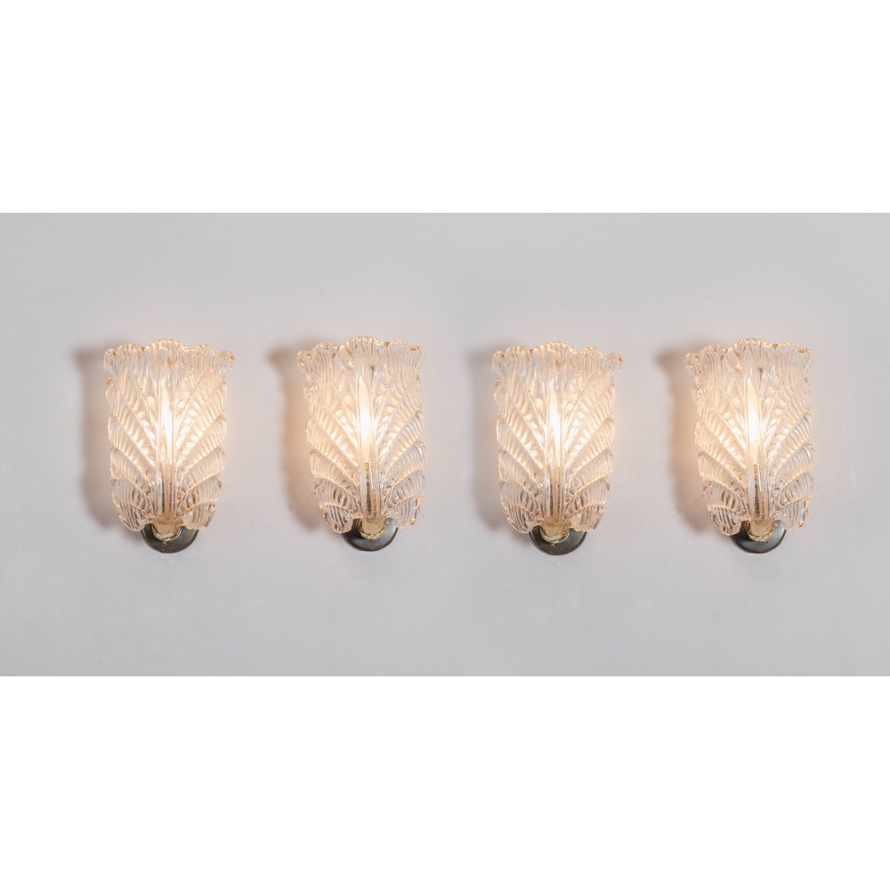 Quattro lampade da parete ad una luce in vetro incolore, corpo a foglia, elementi di raccordo in ottone.